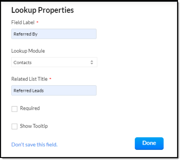 Field Label : Titlul câmpului este afișat folosind această opțiune.Lookup Module :Poți alege modulul la care vrei să adaugi o referință din acest meniu.Related List Title :Acesta este titlul opțiunii, care va apărea în lista asociată din partea stângă a paginii de detalii.4. Dă clic pe Done și salvează layout-ul.
