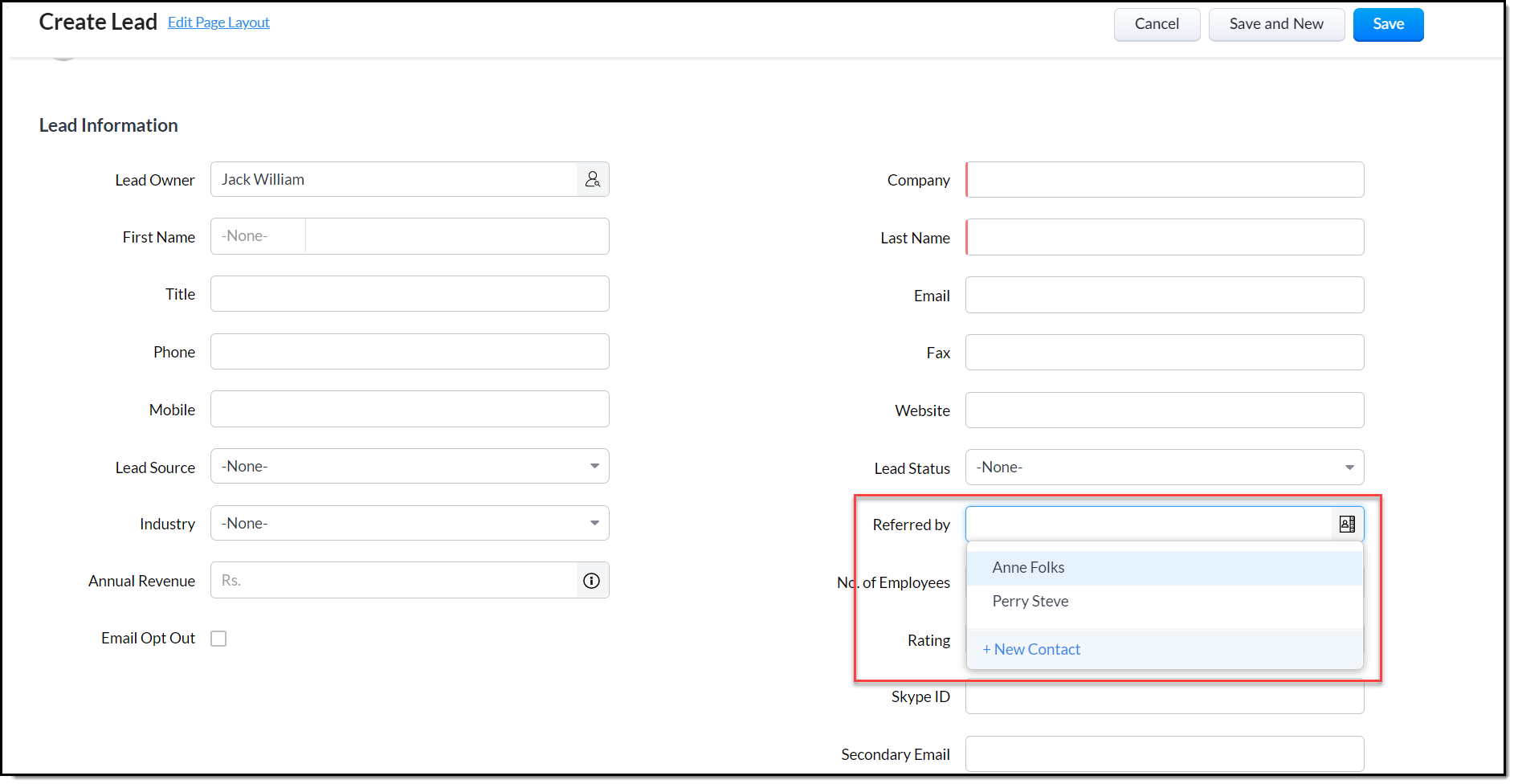- New - Poți adăuga imediat lead-uri noi aici: Dacă un lead este generat din această pagină, câmpul de tip lookup este atribuit contactului de la care a fost generat lead-ul.