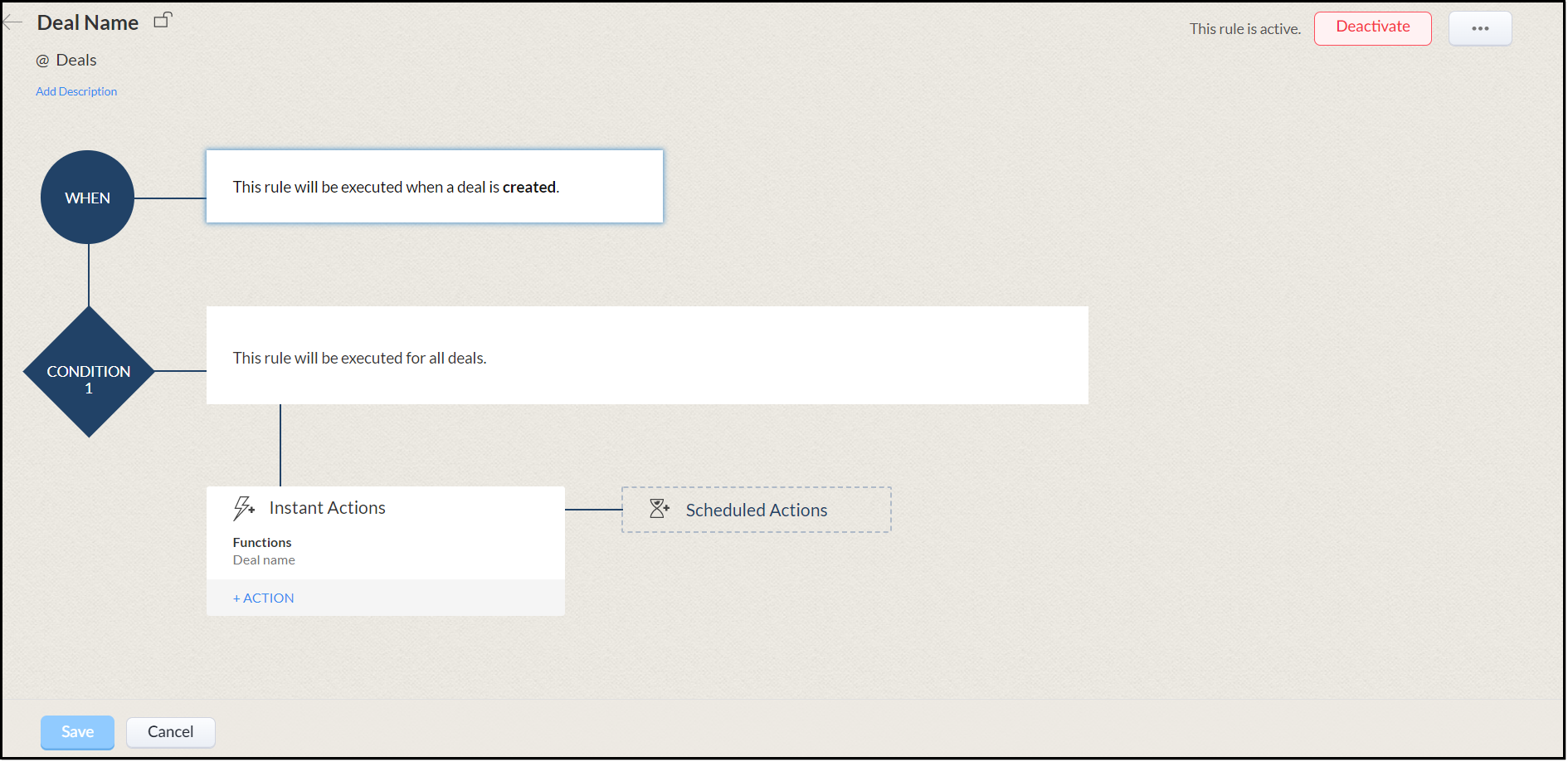 - Selectează „On a record action" în câmpul „When do you want to execute this rule?".