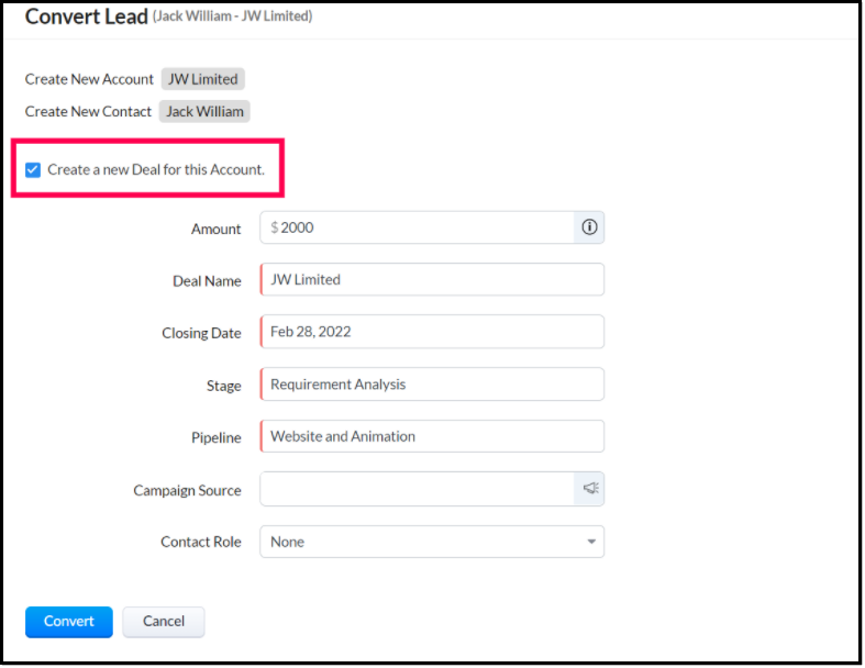 - Alege 'Create a Deal for this Account' când convertești un lead în contact.