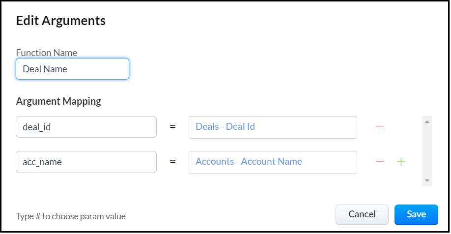 map = Map();//Modifică concatenarea în funcție de convențiile de denumiremap.put("Deal_Name",'Deal for' + ' ' + acc_name);//Pentru exemplul 1, companie de asigurărimap.put("Deal_Name",'Insurance for' + ' ' + acc_name);//Pentru exemplul 2, agenție de turismmap.put("Deal_Name",Trip' + ' ' + acc_name);//Pentru exemplul 3, companie de designmap.put("Deal_Name",'Design for' + ' ' + acc_name);//Pentru exemplul 4, companie imobiliarămap.put("Deal_Name",'Property for' + ' ' + acc_name);//Pentru exemplul 5, institut de educațiemap.put("Deal_Name",'Course for' + ' ' + acc_name);//Acesta este același pentru toate scenariiledealnameupdate = zoho.crm.updateRecord("Deals",deal_id.tolong(),map);info map;info dealnameupdate;