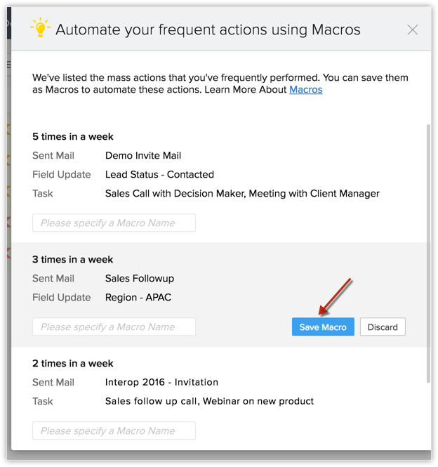 - Zoho CRM nu va sugera din nou un macrou la care ai renunțat timp de 60 de zile de la data renunțării. După o perioadă de 60 de zile, dacă efectuezi aceleași acțiuni, va fi considerat un macrou nou și va fi sugerat din nou.