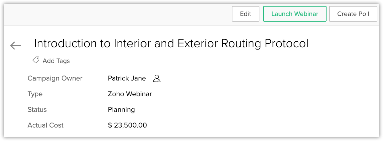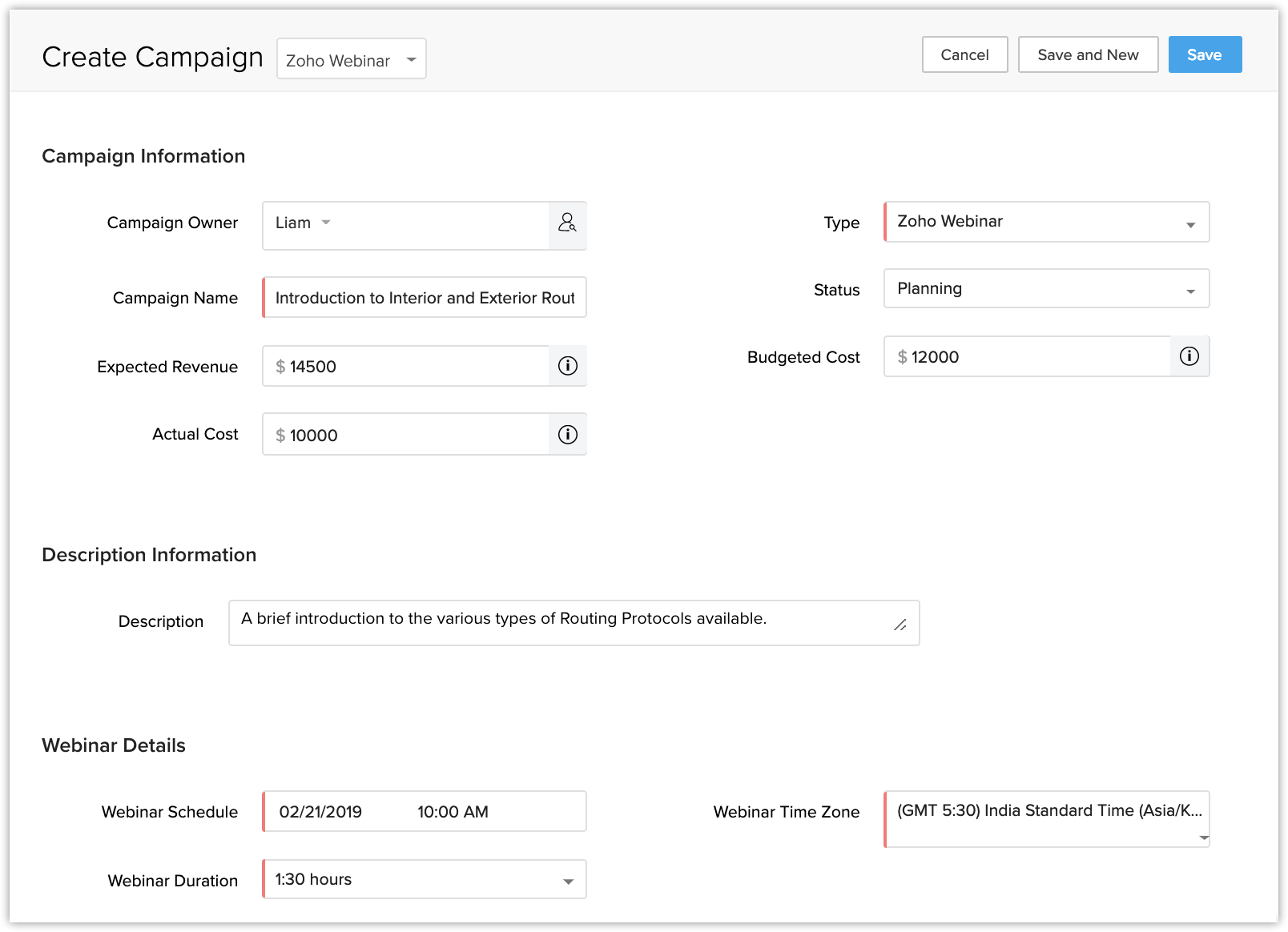 Odată ce integrarea este completă, poți crea webinarii din modulul Campaigns din Zoho CRM.