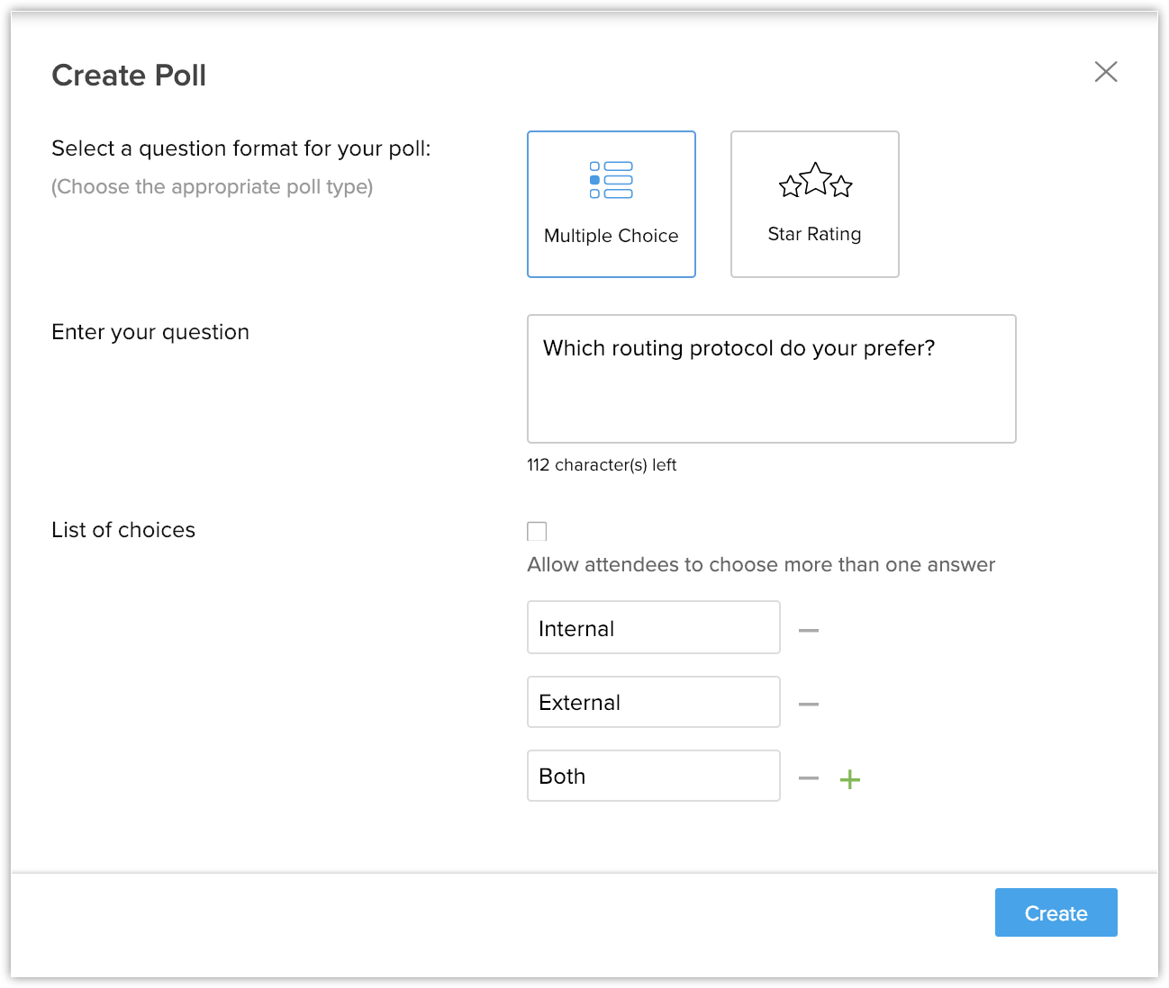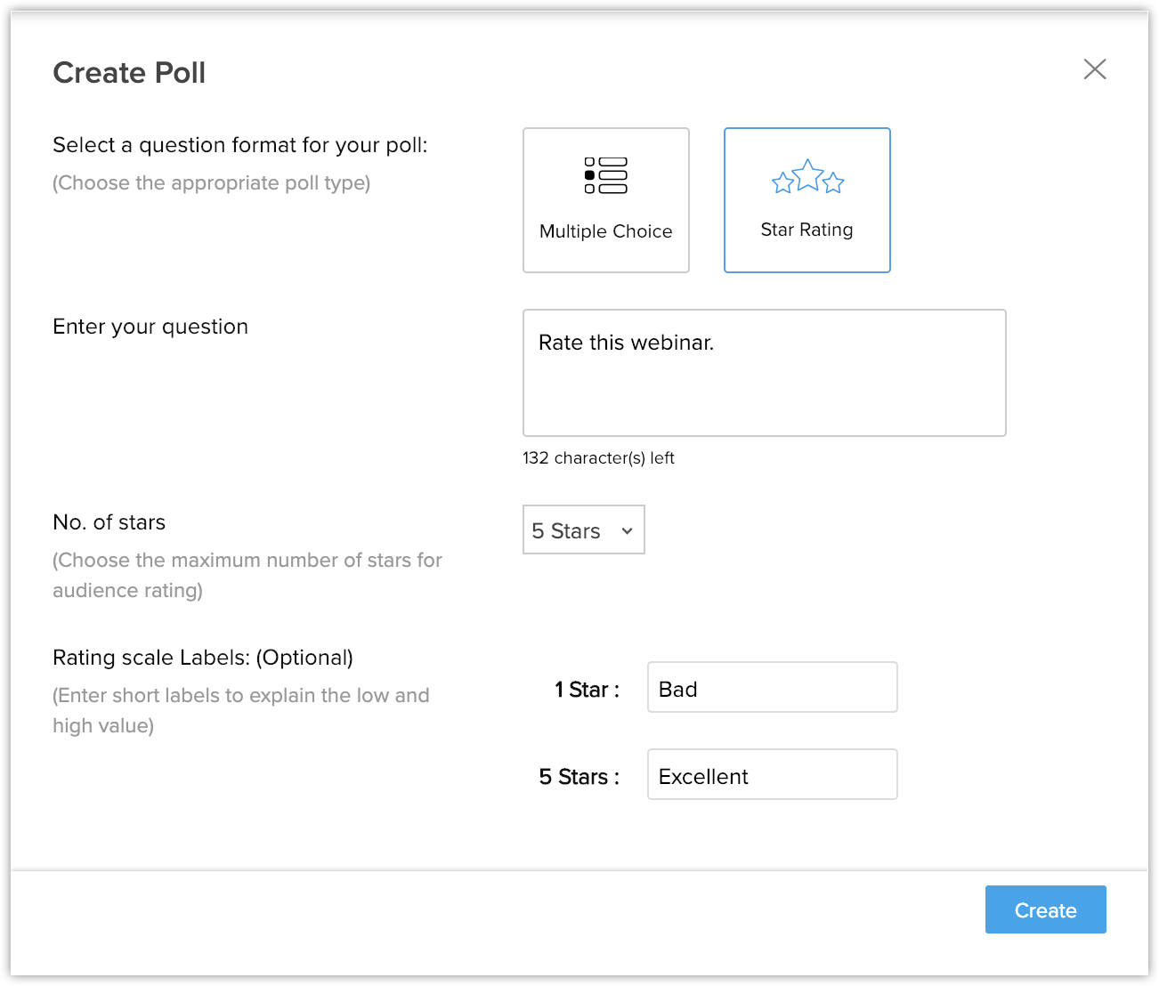 Dacă vrei să creezi un sondaj pentru a colecta recenziile sau opiniile participanților despre un anumit webinar, poți face acest lucru creând un sondaj. Formatul întrebării poate fi selectat din cele două opțiuni disponibile: