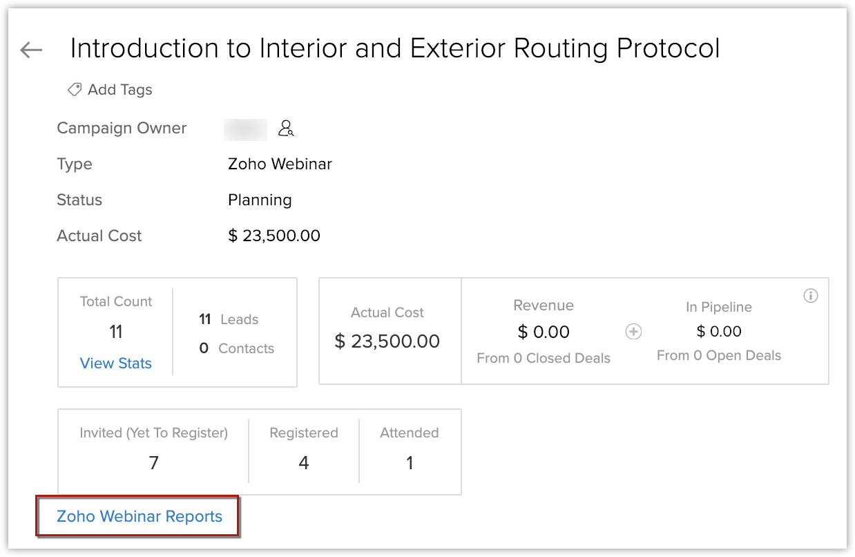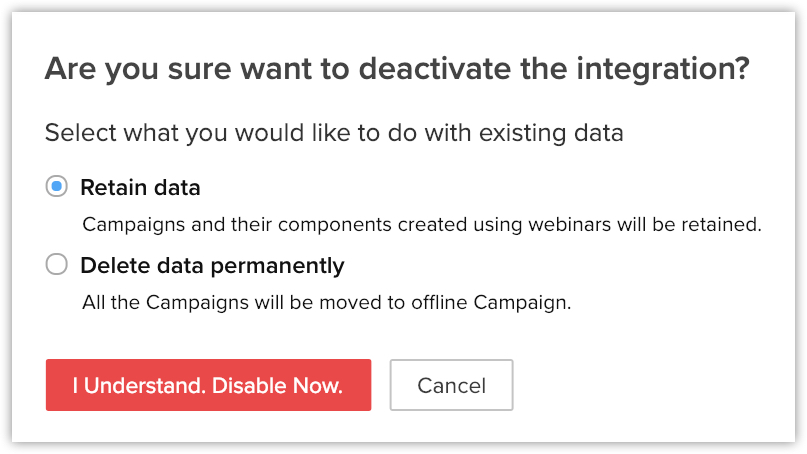 - Retain data - Toate campaniile de webinar create vor fi păstrate, dar nu vei putea crea o nouă campanie de webinar din Zoho CRM.