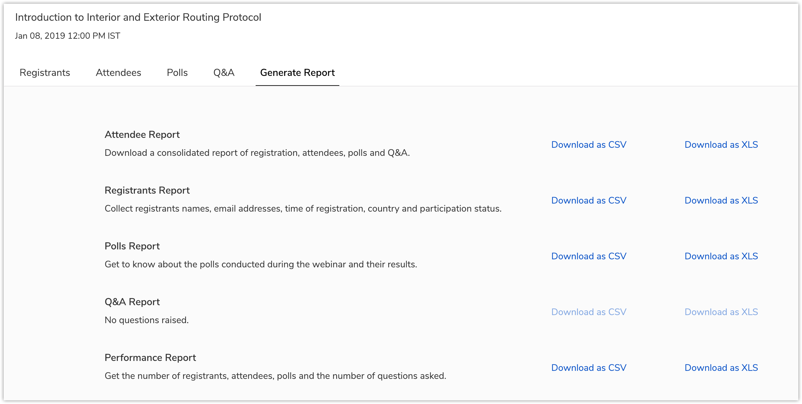 Un raport de webinar va include lista participanților, a persoanelor înregistrate, sondajele, rapoartele Q&A și rapoartele de performanță. Le poți descărca ca fișier CSV sau Excel pentru referință.