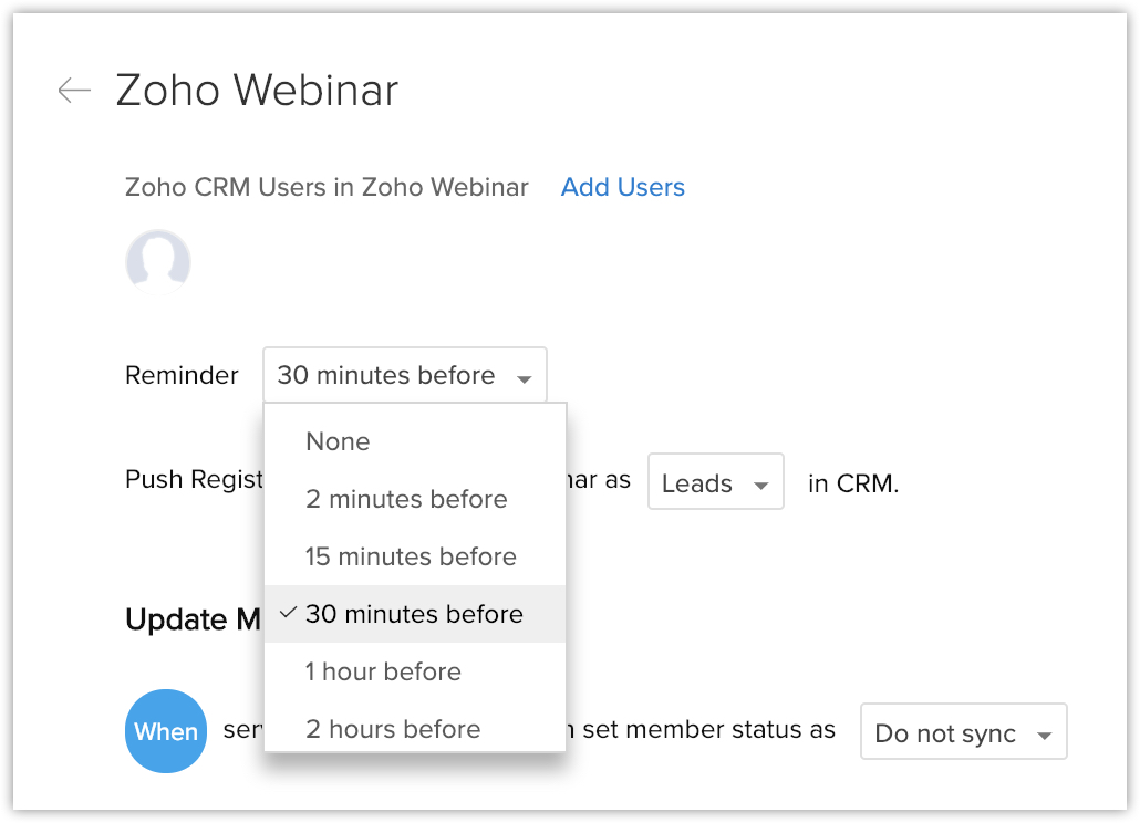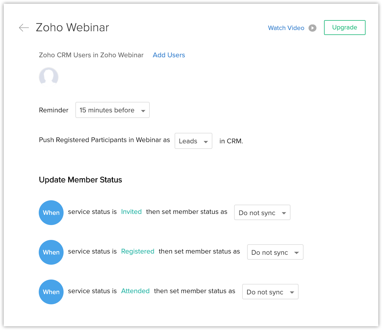 Poți adăuga utilizatori CRM în Zoho Webinar, permițându-le să creeze webinarii din Zoho CRM.