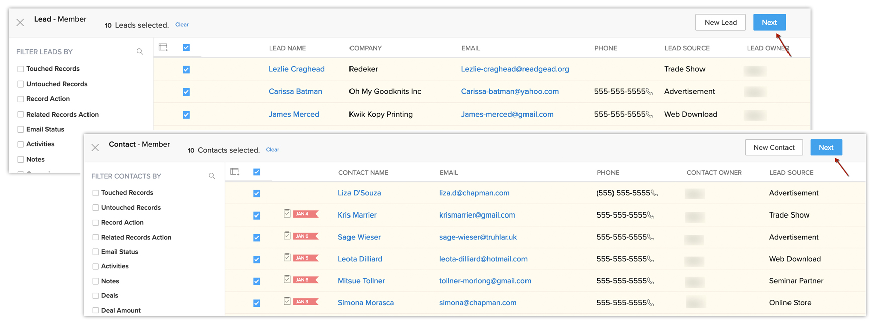 - Selectează lead-urile sau contactele și fă clic pe Next.