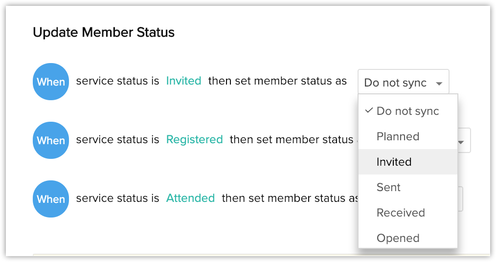 Starea membrilor participanților poate fi sincronizată cu starea serviciului webinarului. De exemplu, dacă starea serviciului este „attended" (participat), poți specifica dacă starea membrului participanților trebuie modificată automat în „planned" (planificat) sau „invited" (invitat). Prin sincronizarea stărilor, nu va trebui să actualizezi manual starea unui participant.