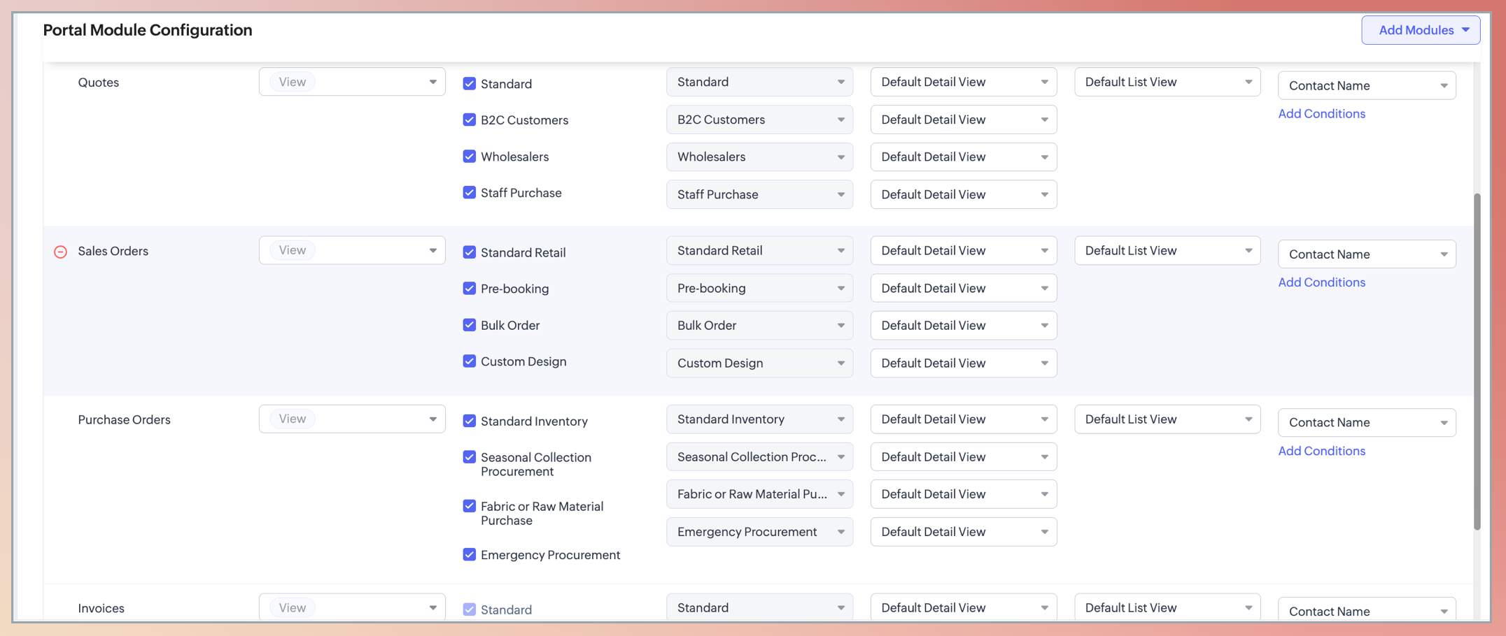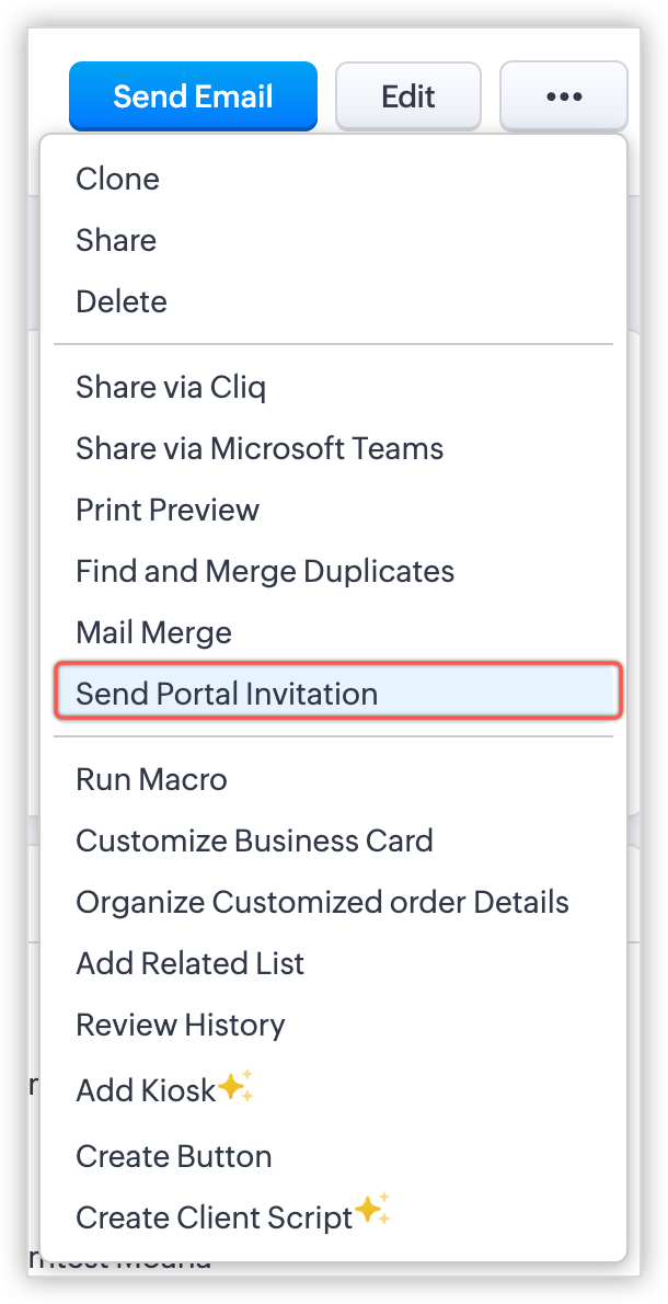 Notă: Permisiunile pentru subformulare trebuie gestionate separat. Permisiunile setate în Configurarea modulului portal al modulului părinte nu se vor aplica pentru subformulare. - Clonare înregistrări asociate cu lead-urile/contactele (tranzacții, facturi, oferte etc.) - Pot clona alte înregistrări care le sunt asociate și pot adăuga mai multe detalii după cum este necesar. De exemplu, dacă un utilizator al portalului dorește să replice o tranzacție, o ofertă sau o factură, în loc să creeze o înregistrare nouă de la zero, poate clona o înregistrare existentă și face modificările necesare.