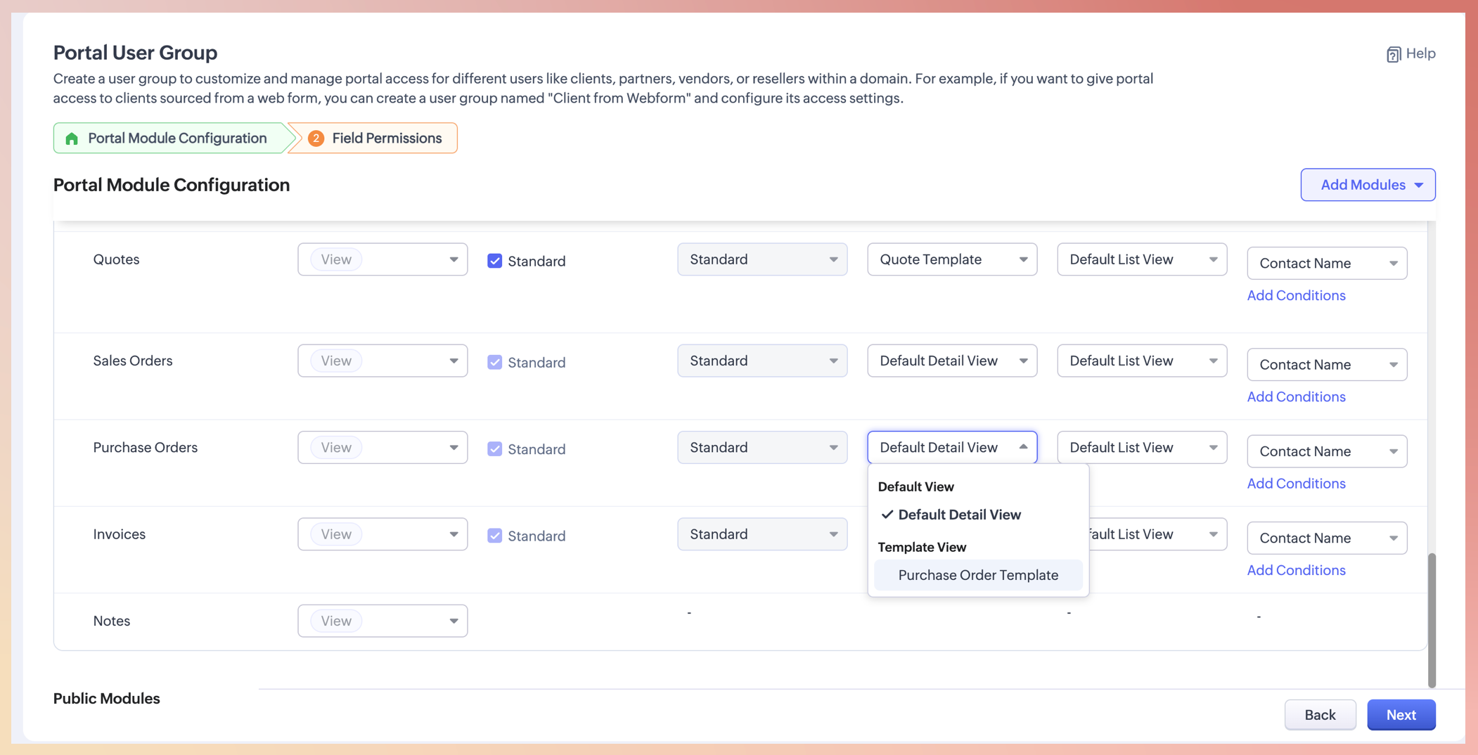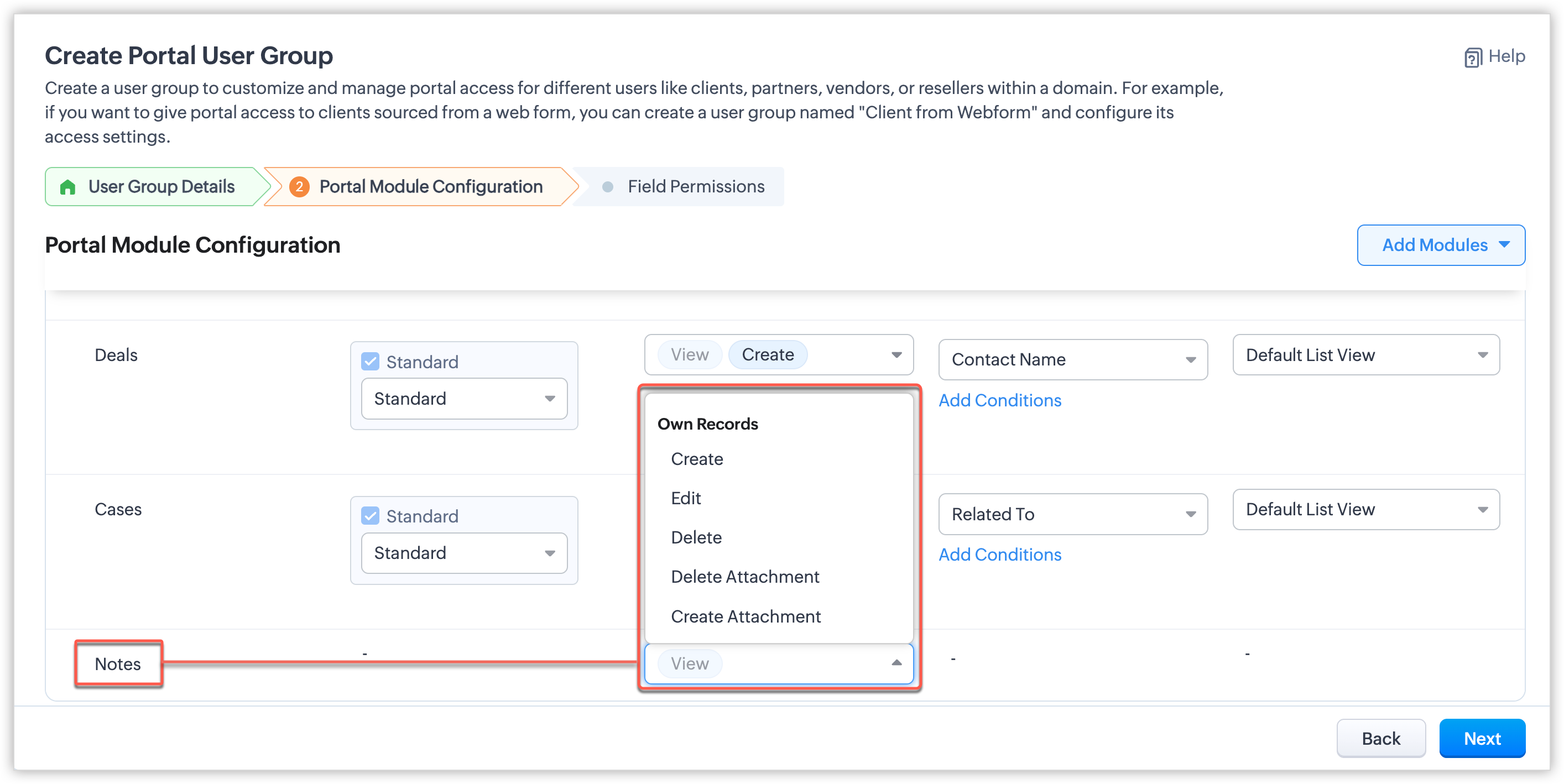 - Permisiuni: Poți seta nivelul de permisiune pentru fiecare înregistrare dintr-un modul. Utilizatorii portalului vor putea efectua acțiuni asupra înregistrărilor doar în baza permisiunilor lor. De exemplu, poți permite utilizatorilor portalului să vizualizeze sau să editeze numărul lor de licență sau adresa poștală, sau poți da unui furnizor permisiune de citire pentru comenzile de cumpărare. Alege permisiunile pentru module: creare, editare, vizualizare, ștergere sau editare (partajat). Permisiunea editare (partajat) va permite utilizatorilor portalului să editeze înregistrările adăugate de utilizatorii CRM în modul.