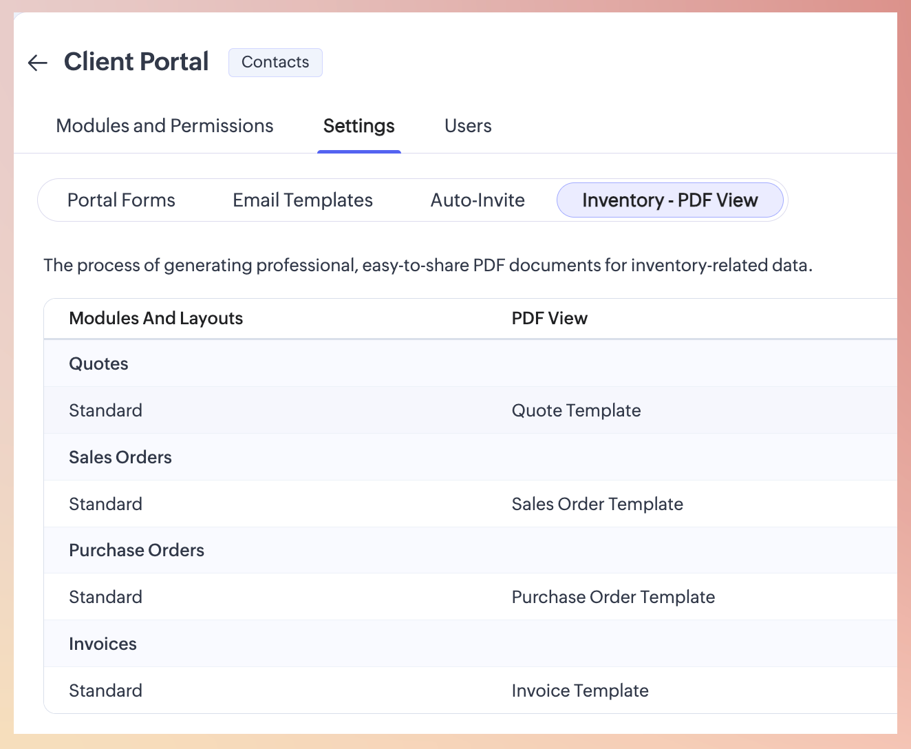 Doar prin atribuirea unei vizualizări șablon în modulele de inventar se poate vizualiza aceasta din contul de Portal.