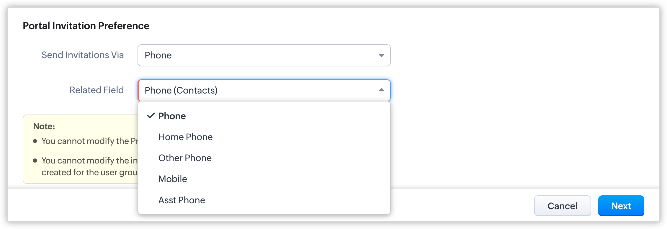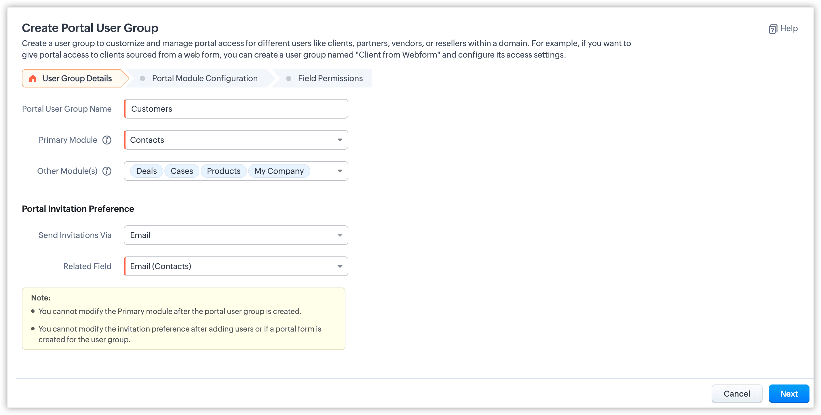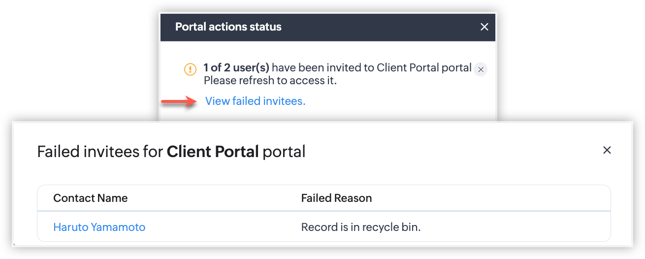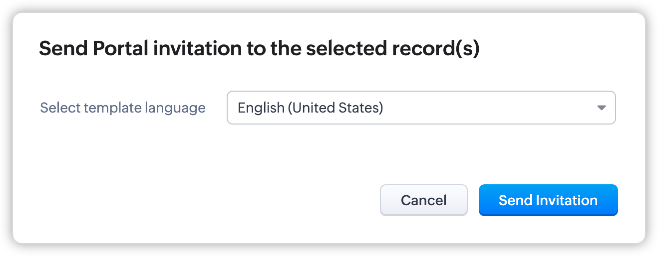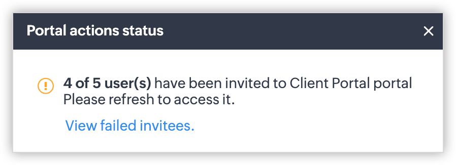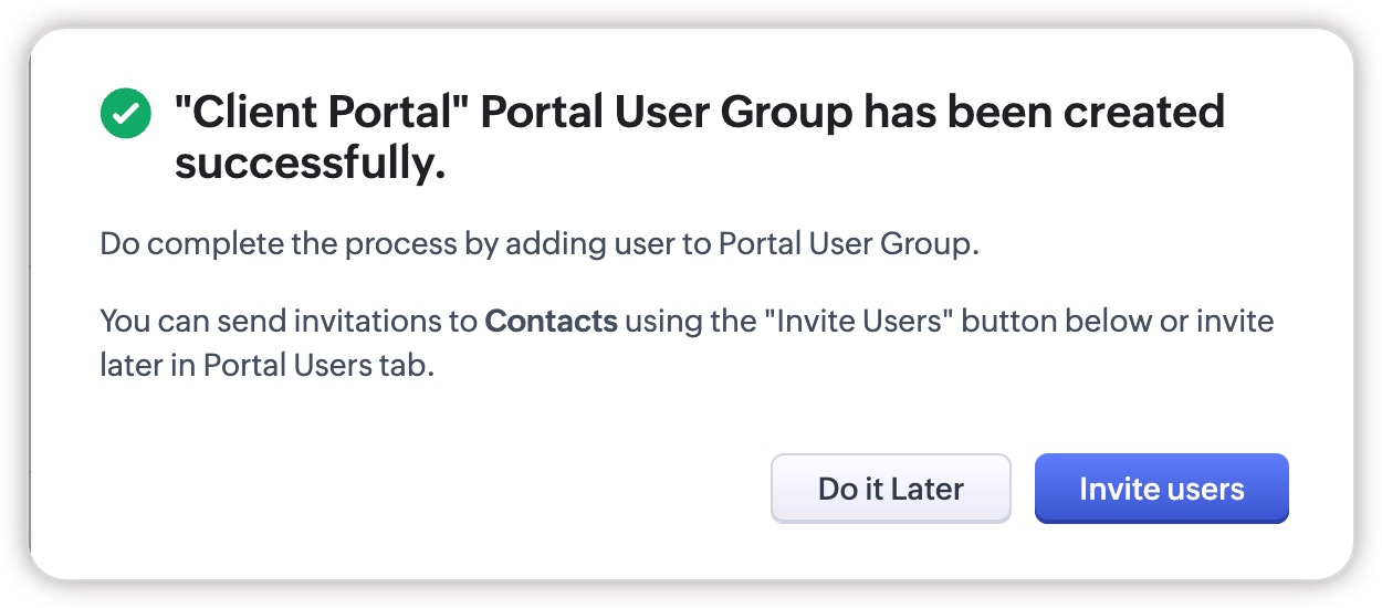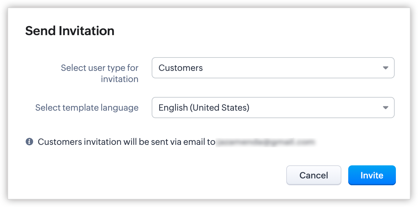 - După ce preferința de invitație este setată pentru un grup de utilizatori ai portalului, nu o vei putea modifica odată ce utilizatori au fost adăugați sau dacă a fost creat un formular de portal pentru acesta. Dacă este necesar, contactează support@zoho.com.
