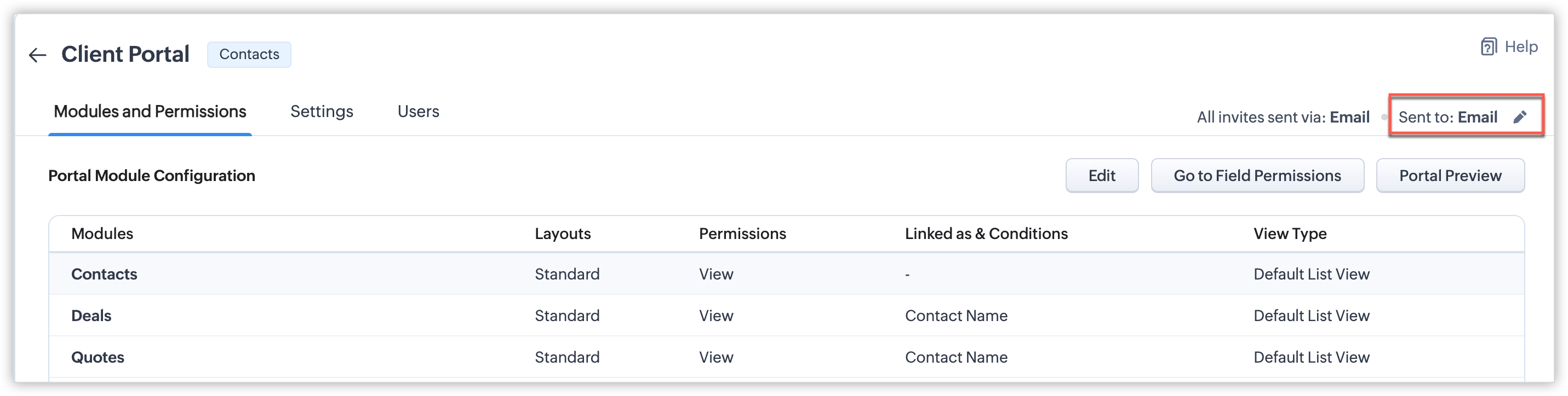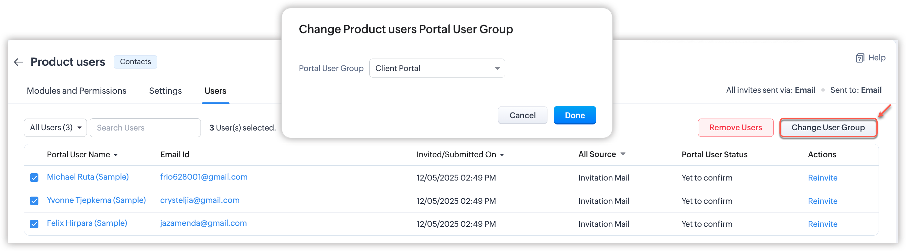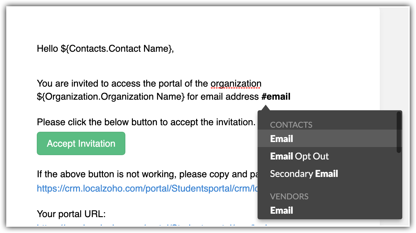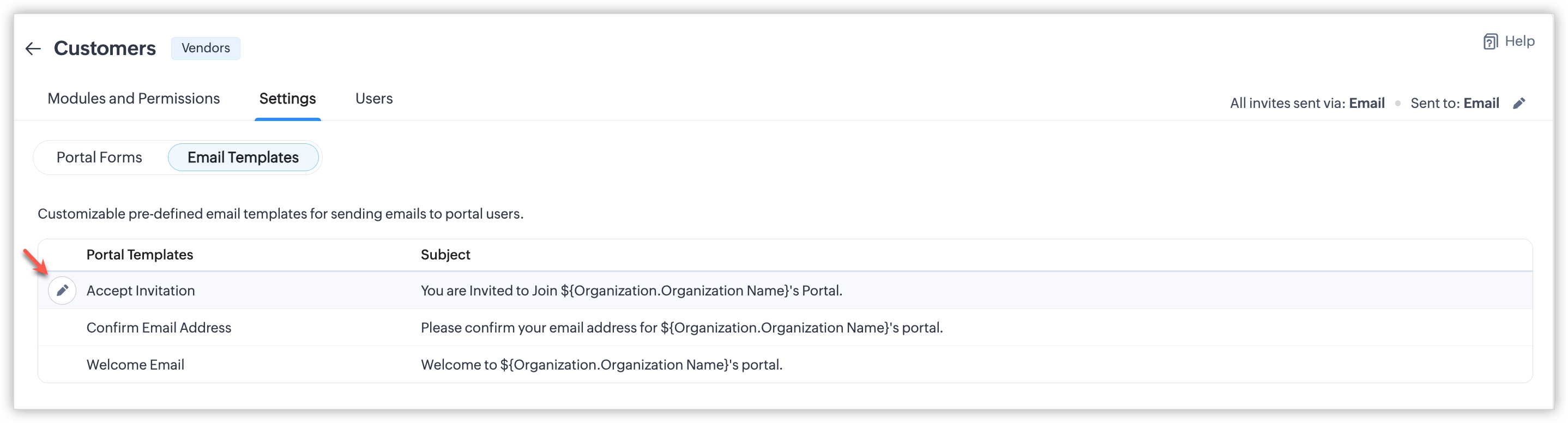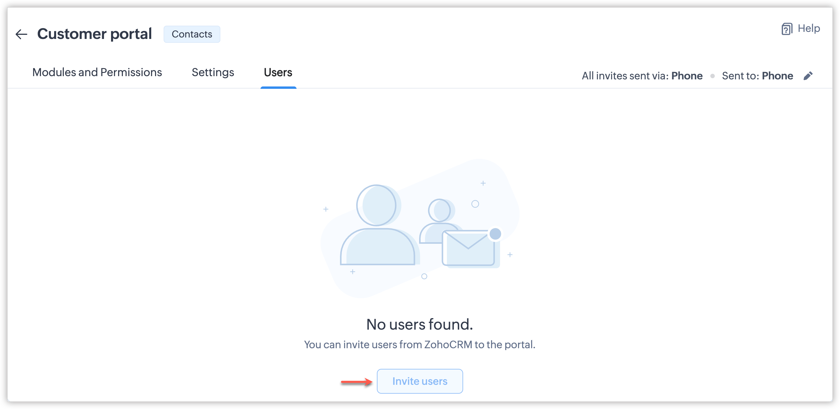 - După ce preferința de invitație este setată pentru un grup de utilizatori ai portalului, nu o vei putea modifica odată ce utilizatori au fost adăugați sau dacă a fost creat un formular de portal pentru acesta. Dacă este necesar, contactează support@zoho.com.