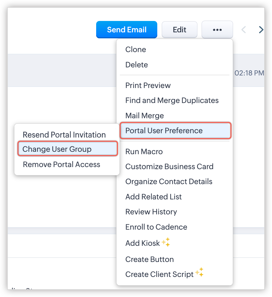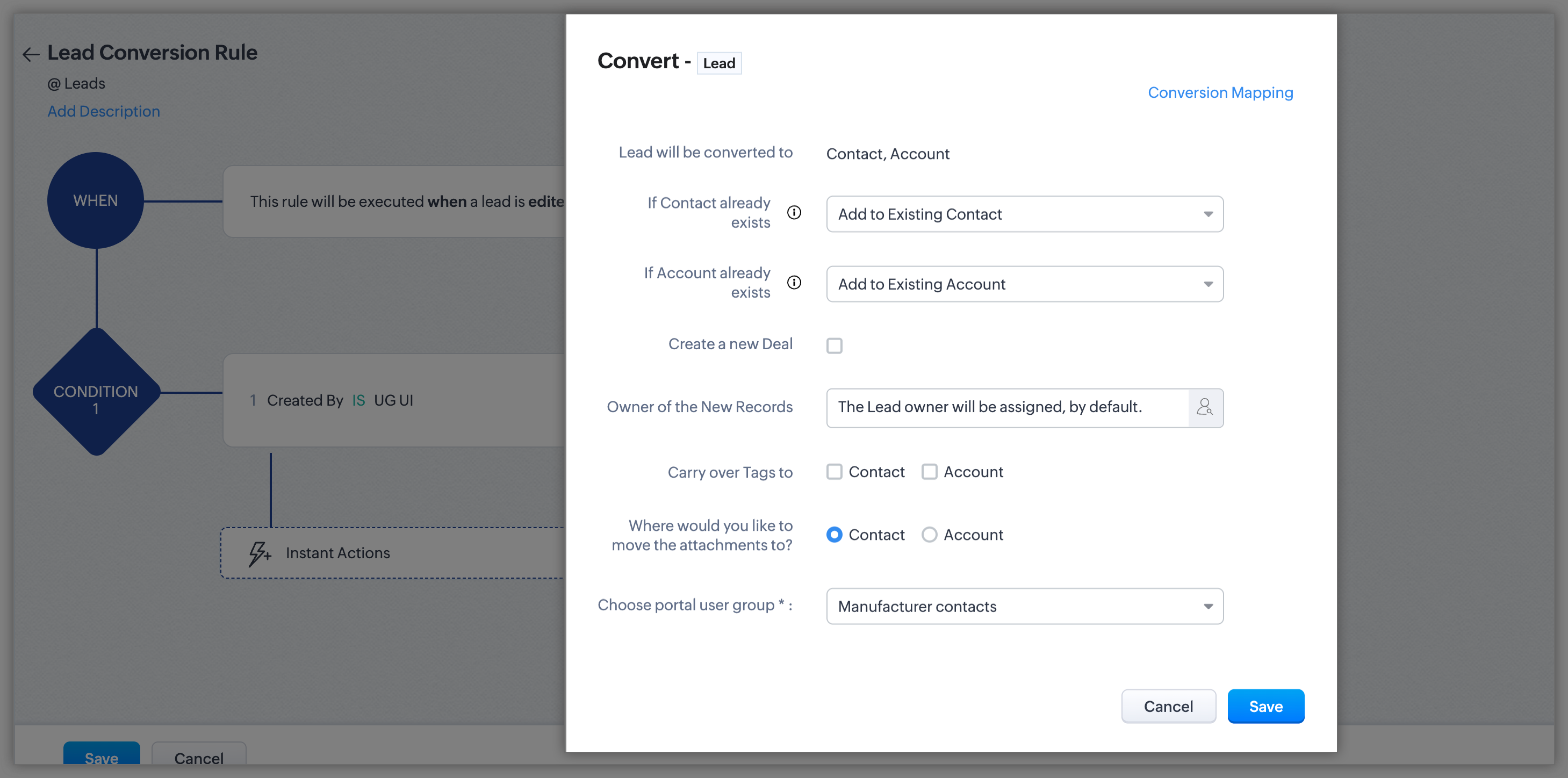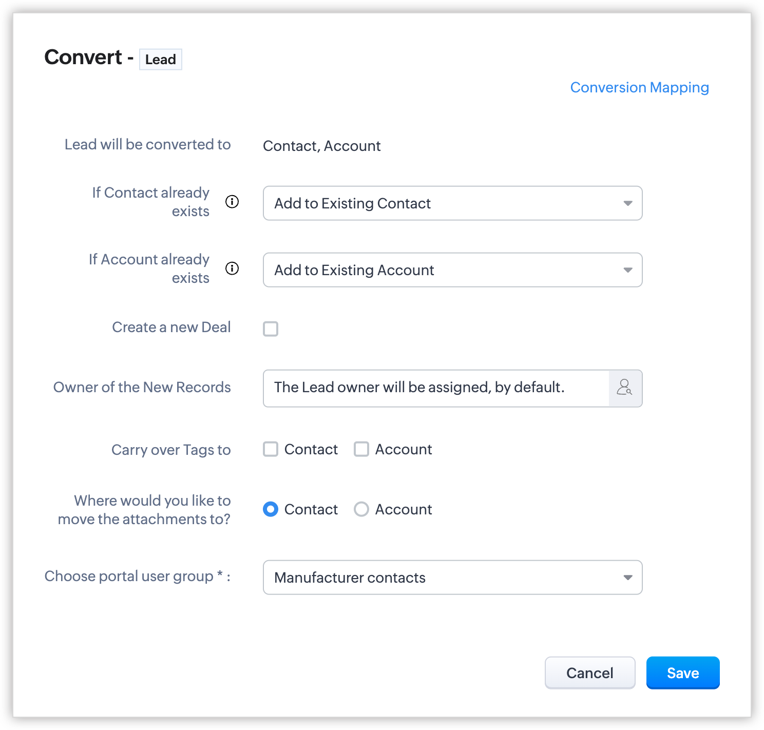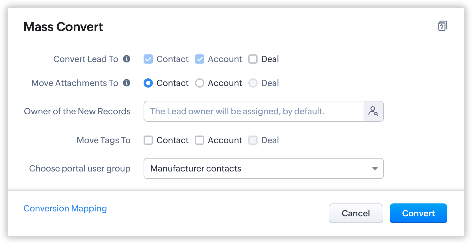 - În timpul conversiei - În Zoho CRM, poți converti leadurile calificate în contacte fie manual, fie automat folosind regulile de workflow. Dacă ai creat un grup de utilizatori ai portalului pentru leaduri și două grupuri de utilizatori pentru contacte și ai adăugat leadurile și contactele CRM la portalurile corespunzătoare, vei fi solicitat să alegi unul dintre grupurile de utilizatori ai portalului pentru contacte atunci când convertești leadurile în contacte în CRM-ul tău.