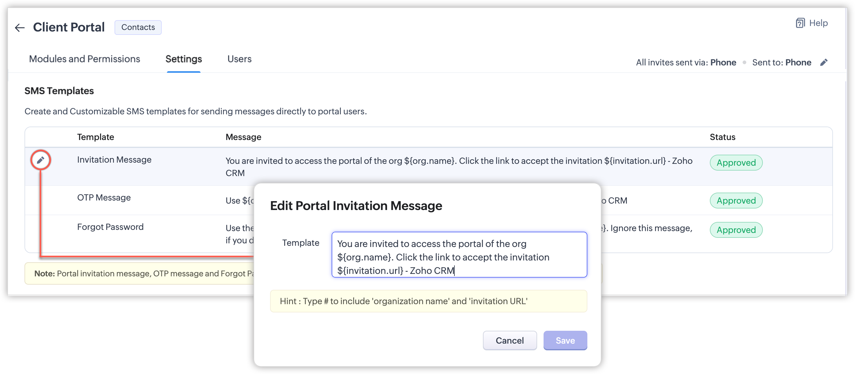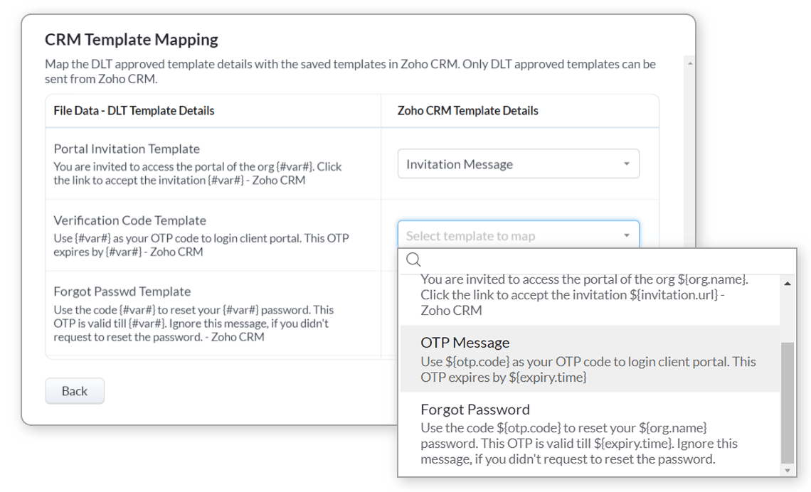 - Șabloanele SMS pentru mesajele legate de portal pot fi utilizate odată ce au fost aprobate DLT și verificate de Zoho.