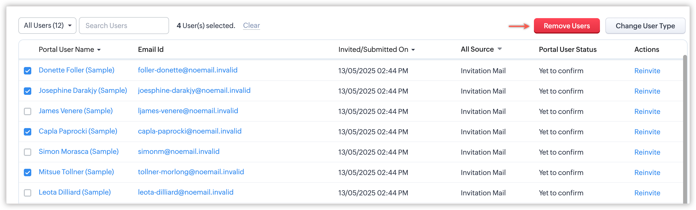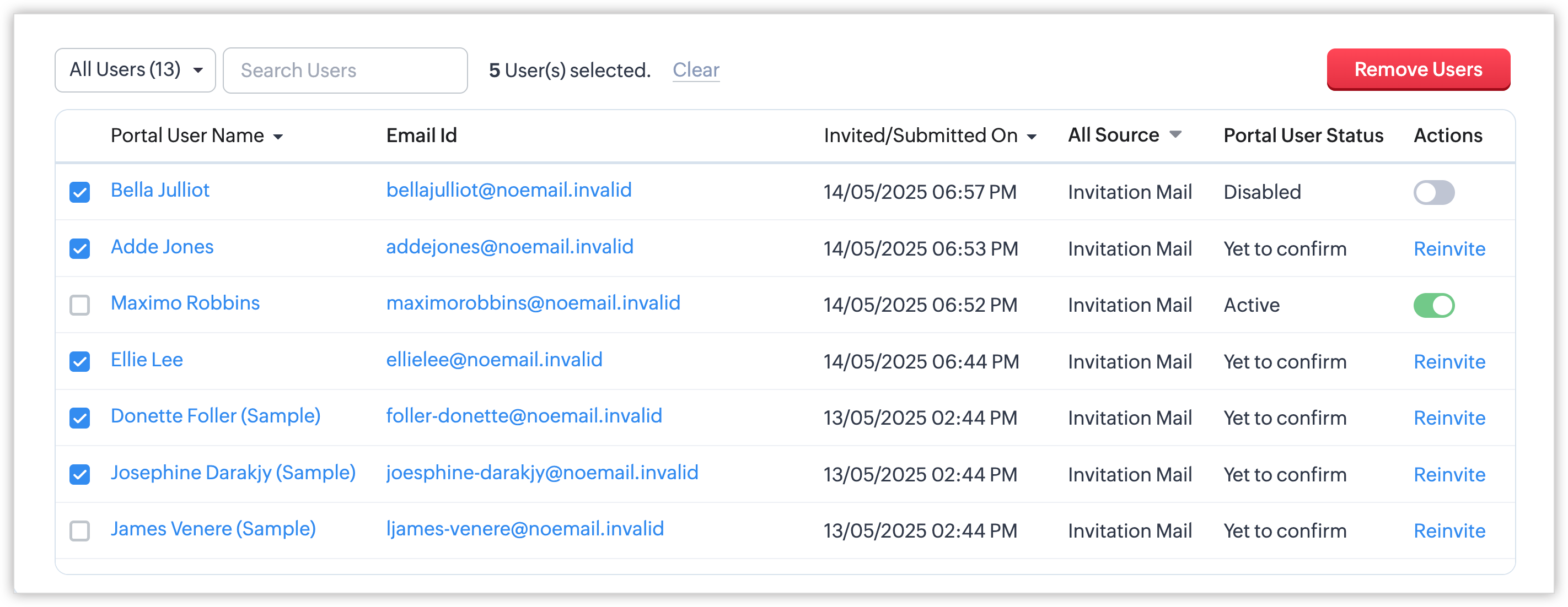 - Invitation not yet accepted: Acești utilizatori nu au acceptat invitația la portal. Emailul de acceptare a invitației va fi trimis la efectuarea acțiunii de re-invitare în masă.