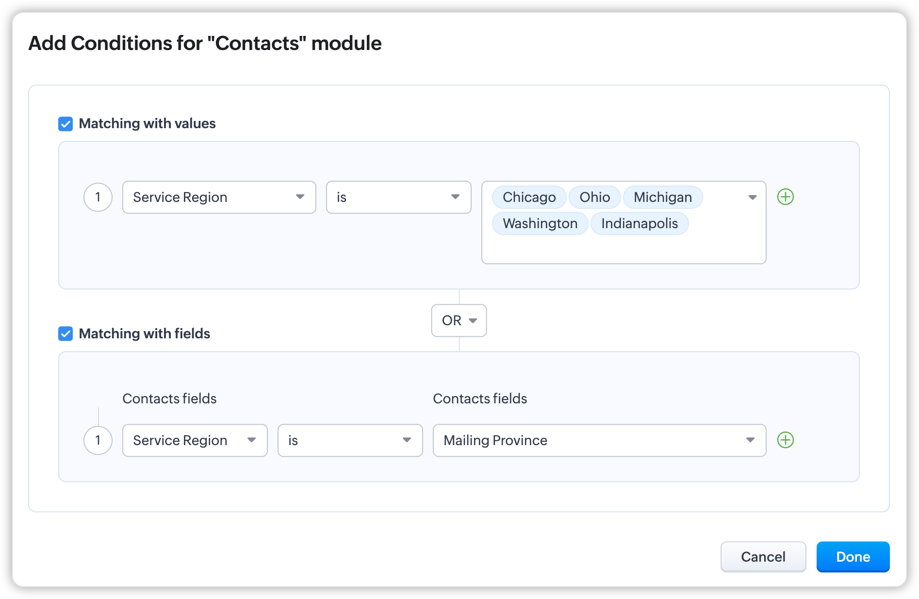 Pe lângă aceste informații tranzacționale directe, dacă dorești să expui alte înregistrări cu o caracteristică dorită - aceasta poate fi realizată prin intermediul condițiilor. Poți configura atât câmpuri de legătură cât și/sau criterii pentru a afișa înregistrările în modulele asociate. - Potrivire după valoare: Aici poți defini un criteriu bazat pe valorile lor. De exemplu: Poți alege să afișezi toate înregistrările din modulul Arhitecți dacă experiența lor este mai mare de 6 ani.