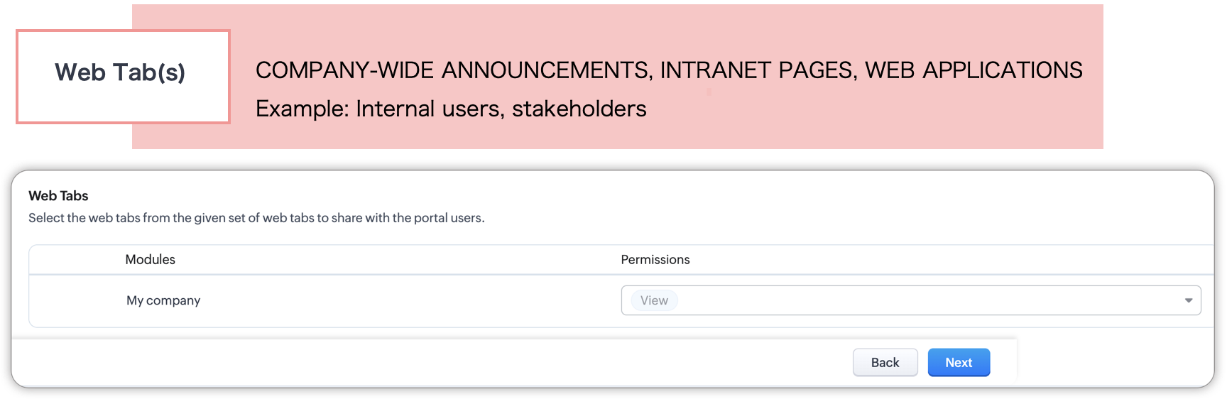 - Taburi web: Ca organizație, este posibil să ai câțiva clienți care accesează CRM-ul tău cu ajutorul portalurilor. Pe lângă vizualizarea modulelor și a înregistrărilor asociate, aceștia pot accesa și taburile web.