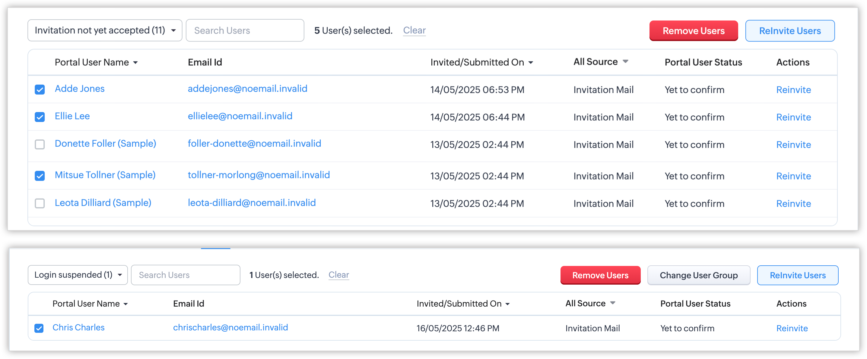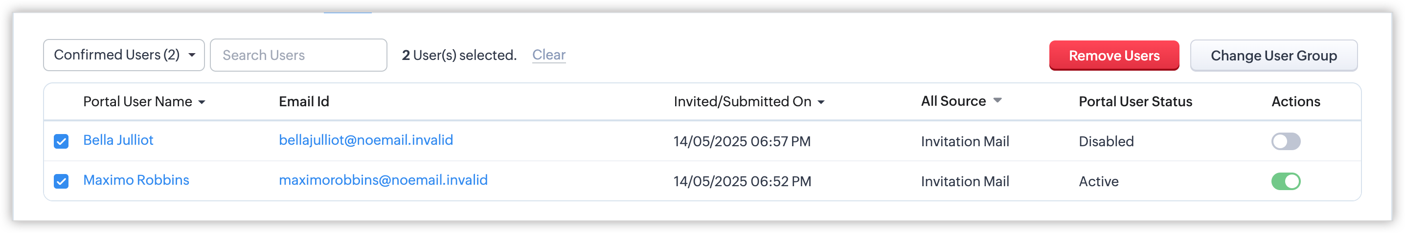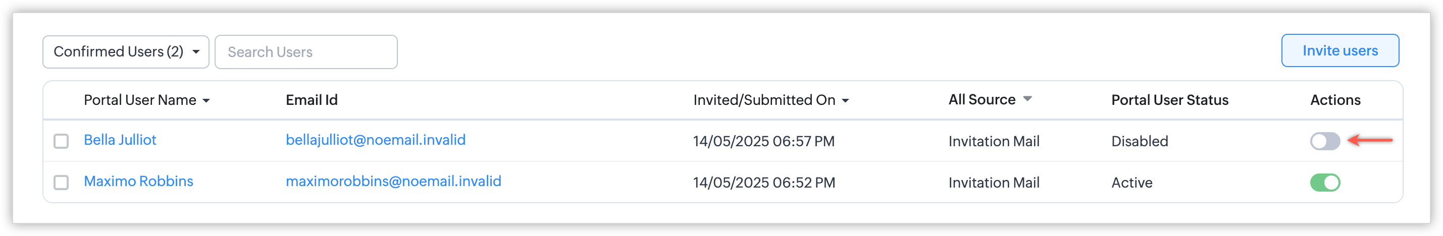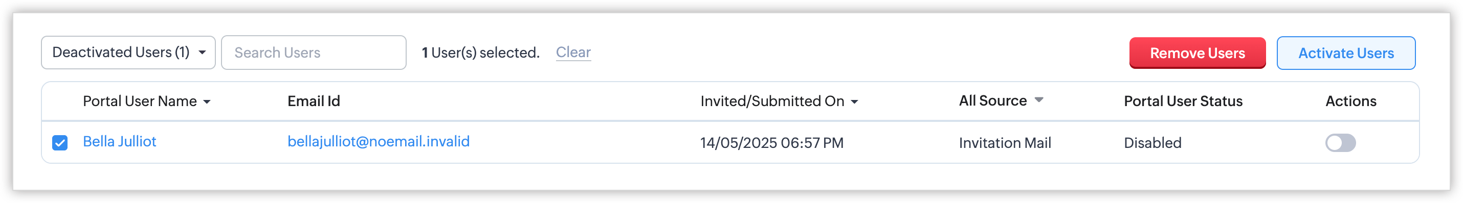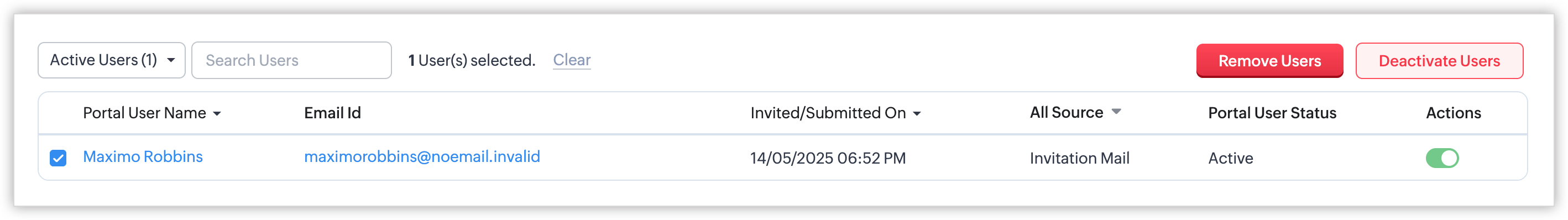 - Deactivated Users: Acești utilizatori sunt cei al căror acces la portal a fost revocat de organizație. Poți activa accesul, schimba grupul de utilizatori ai portalului sau elimina utilizatori.