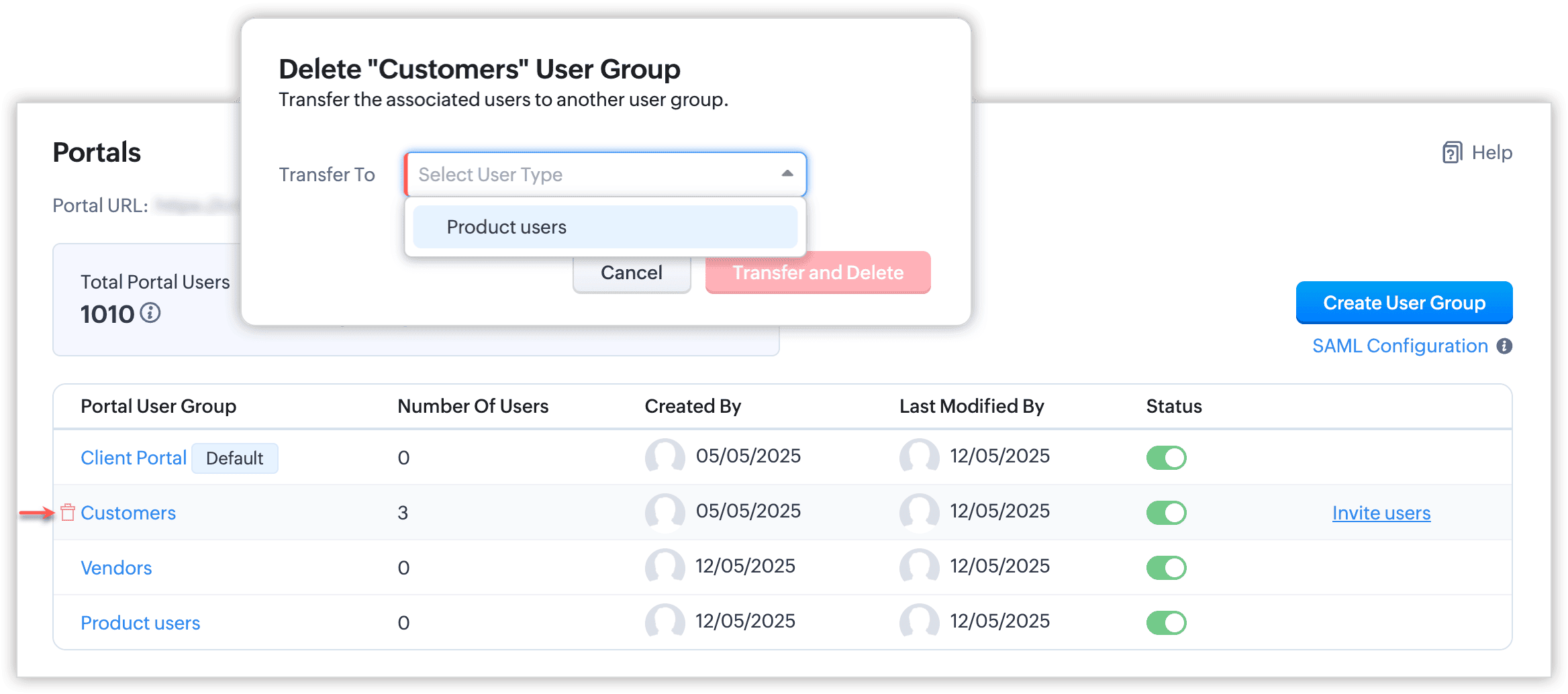 - Dacă există utilizatori în grupul de utilizatori și un alt grup de utilizatori al aceluiași modul, pentru a transfera utilizatorii portalului, alege un grup de utilizatori ai portalului din lista derulantă și fă clic pe Transfer and Delete.