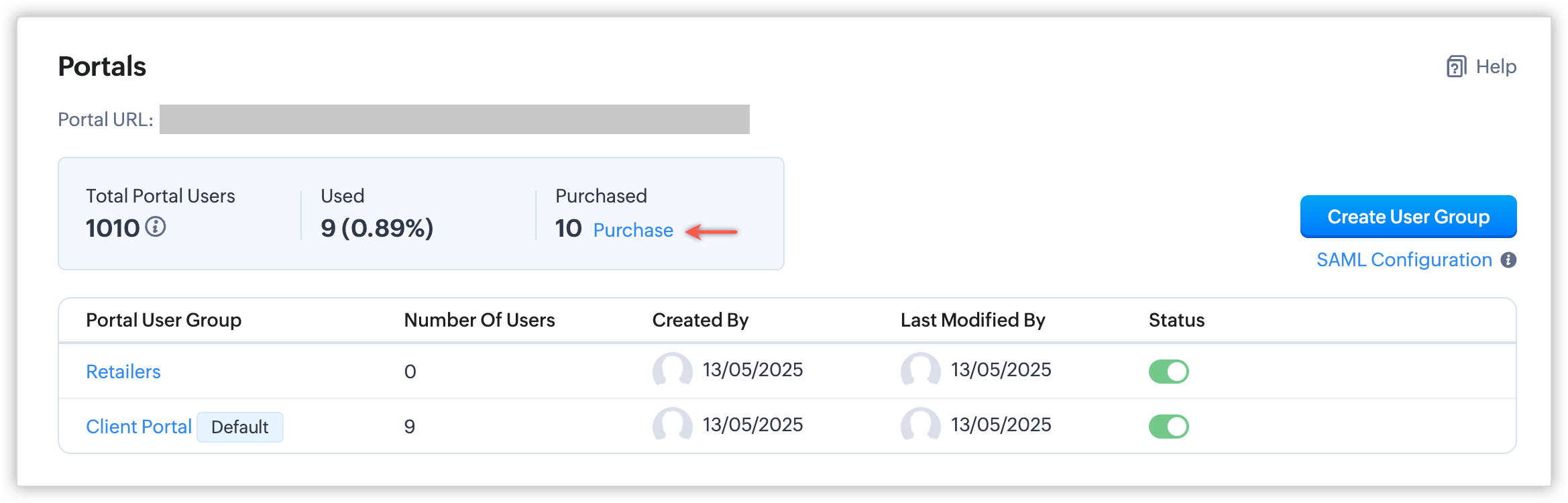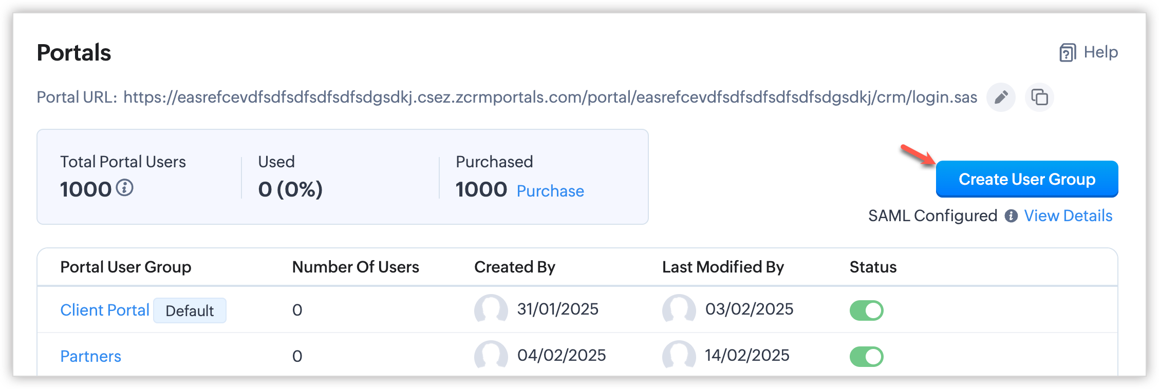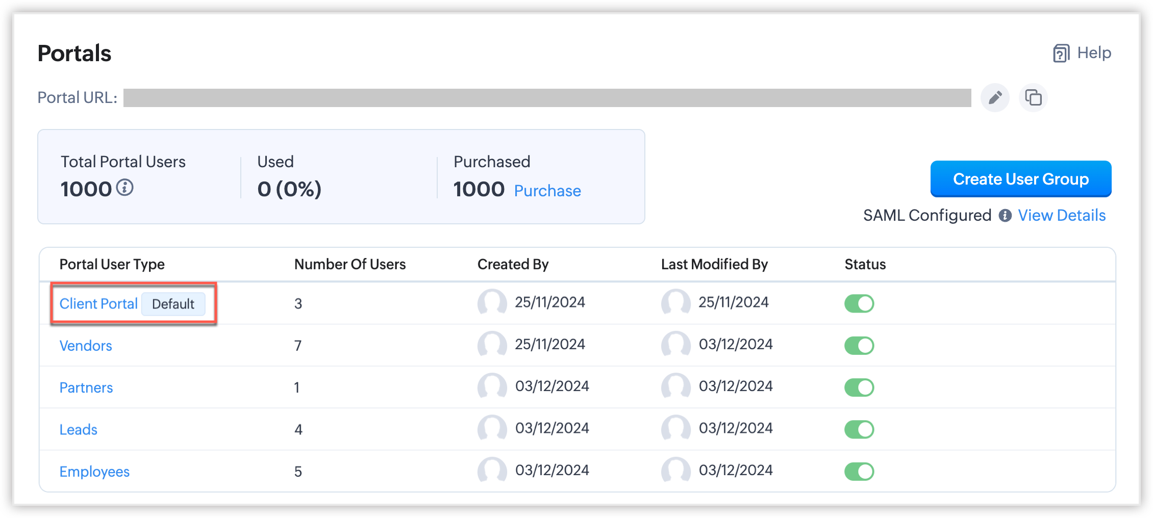 - Când creezi un portal, va fi creat un grup implicit de utilizatori ai portalului numit Client Portal, care nu poate fi șters. Totuși, poți activa sau dezactiva Starea grupului de utilizatori oricând este necesar.