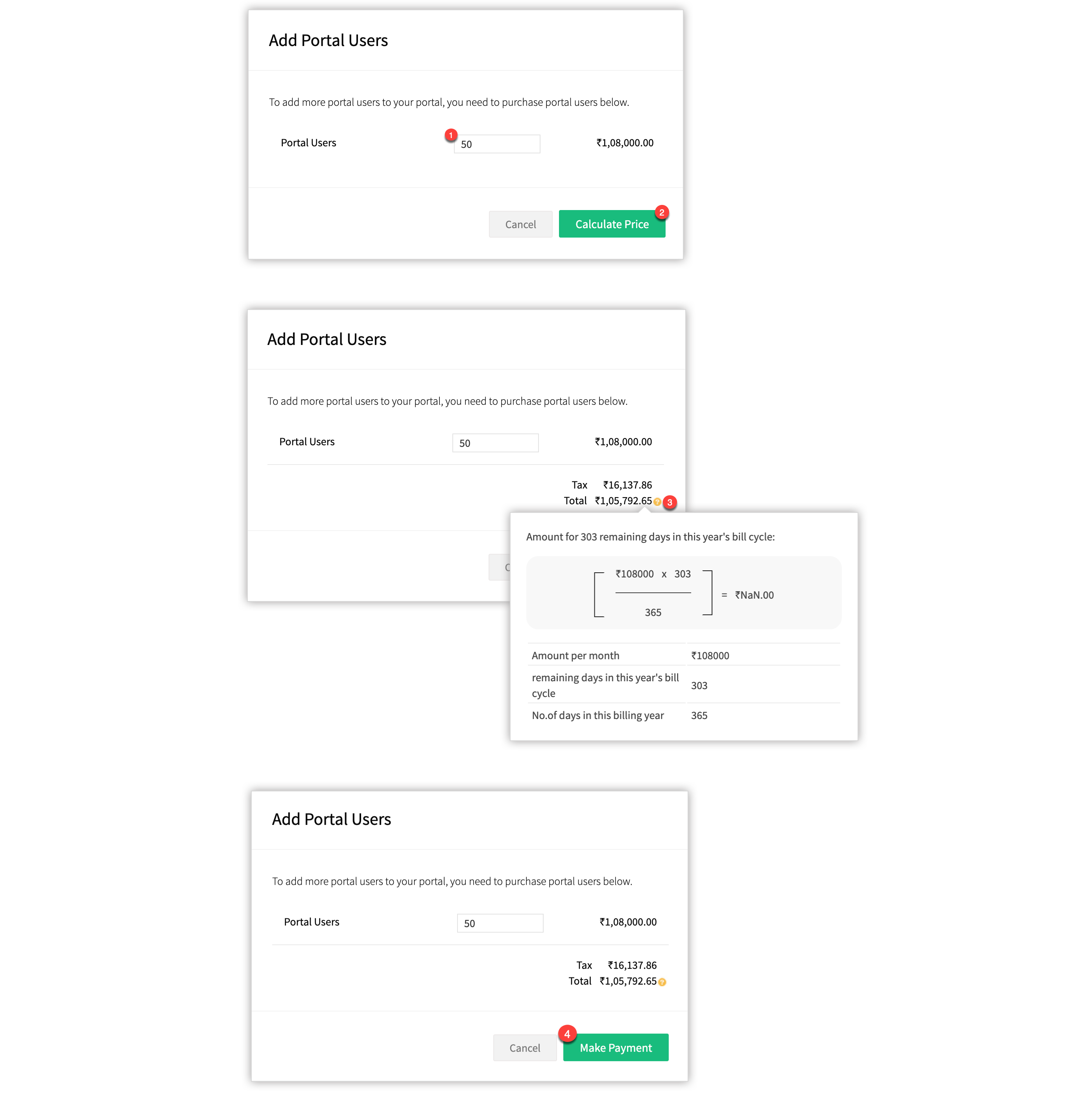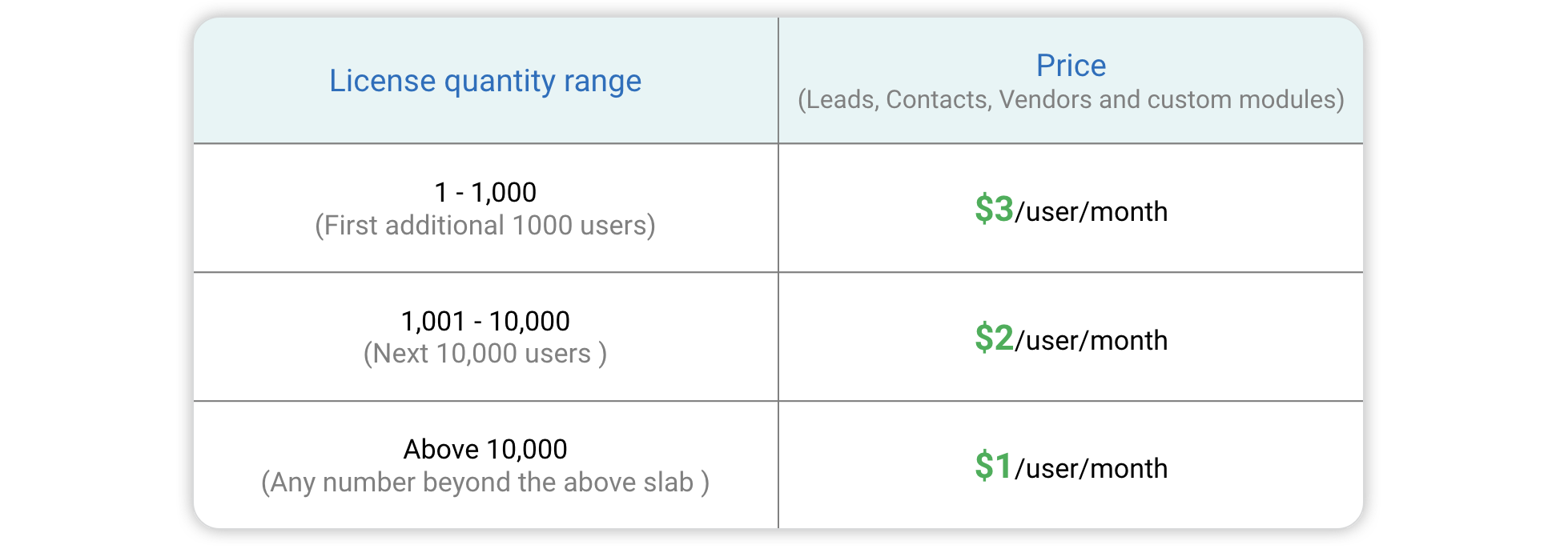 - Pentru a achiziționa licențe suplimentare de utilizatori ai portalului, consultă tabelul de mai jos pentru prețuri. Dacă ai nevoie de ajutor privind achizițiile, contactează support@zohocrm.com.
