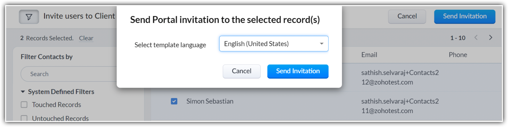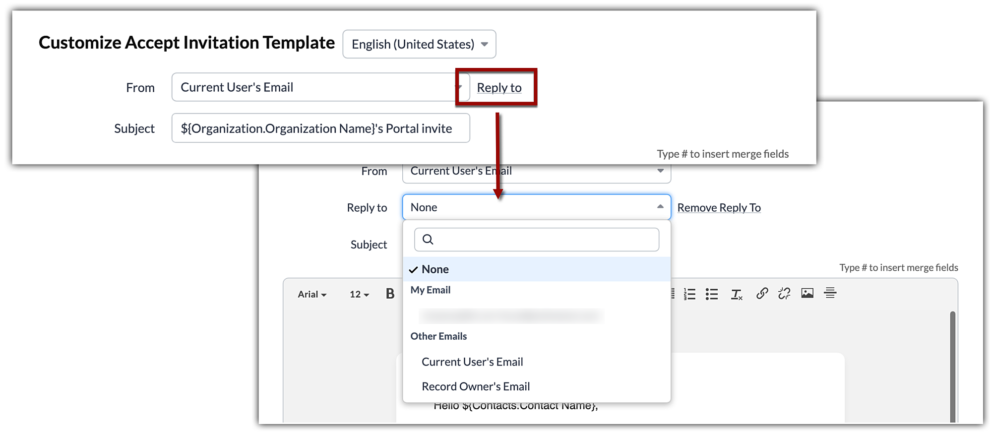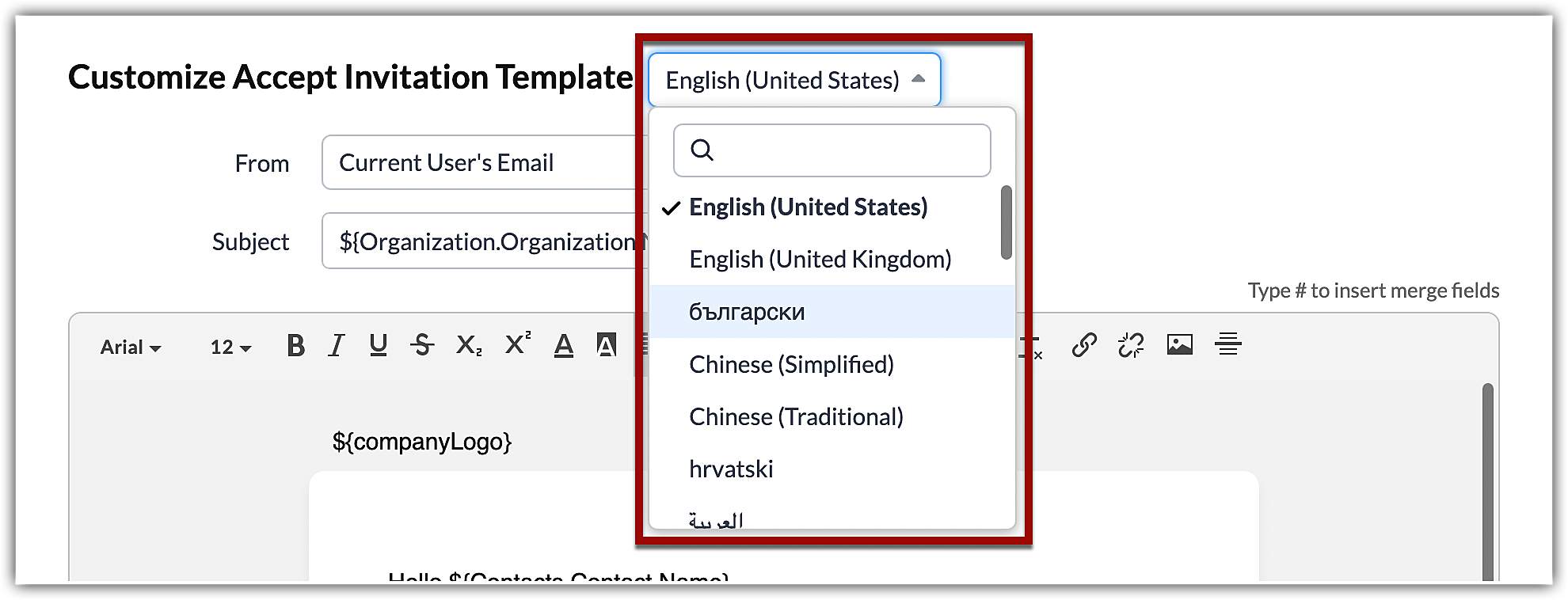 - Schimbarea limbii în timp ce trimiți un email de invitație va traduce automat doar conținutul implicit furnizat de sistem al emailului. Conținutul personalizat trebuie tradus separat pentru limba respectivă.