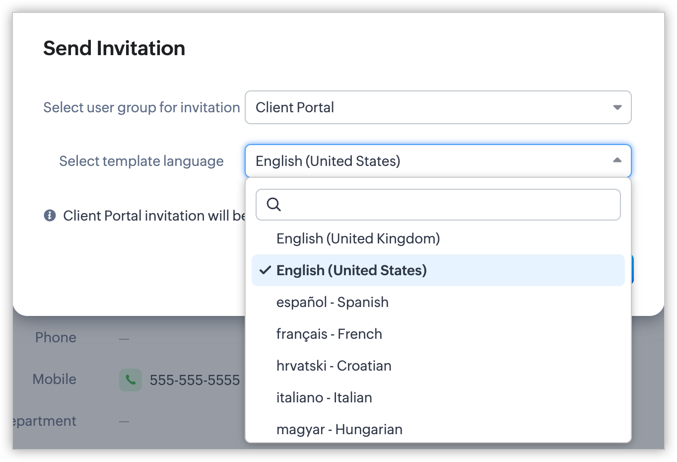 La invitarea utilizatorilor, administratorii vor fi solicitați să selecteze limba pentru emailul de invitație. Șablonul salvat pentru acea limbă va fi folosit pentru trimiterea emailului.