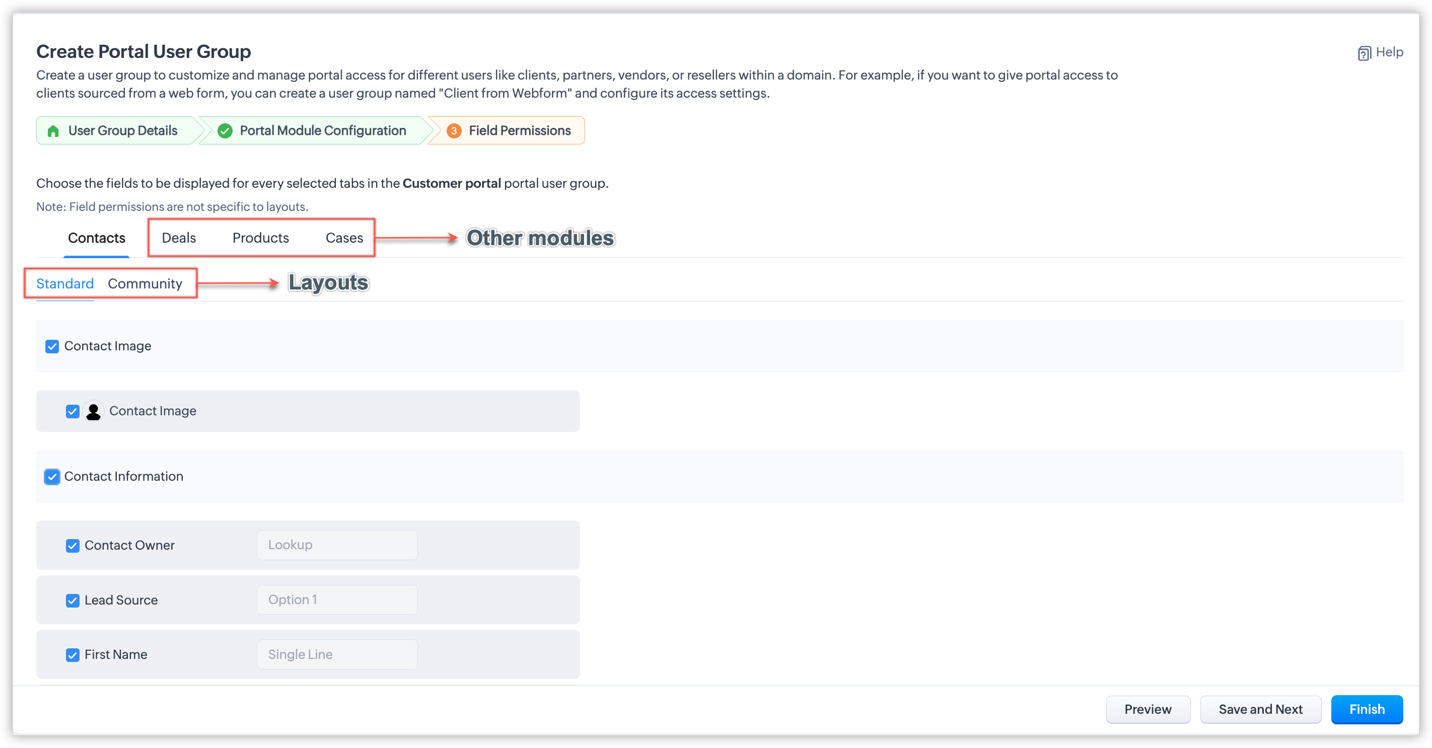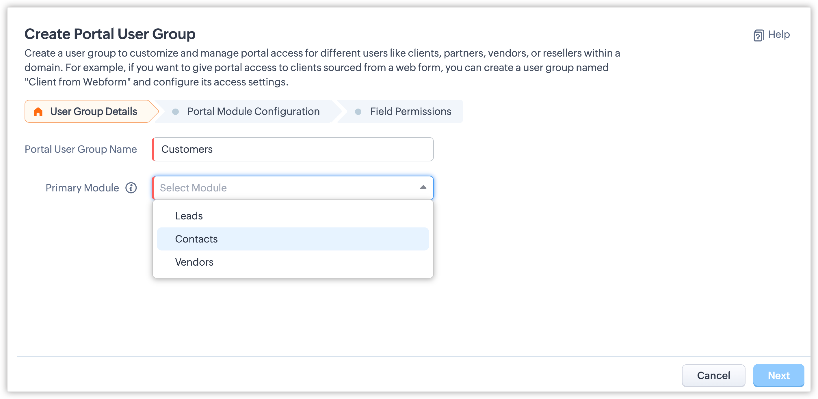 - Poți configura până la cinci grupuri de utilizatori ai portalului. În mod implicit, poți invita în total până la 1.000 de utilizatori în toate grupurile de utilizatori (Leads, Contacte, Furnizori și module personalizate) gratuit.