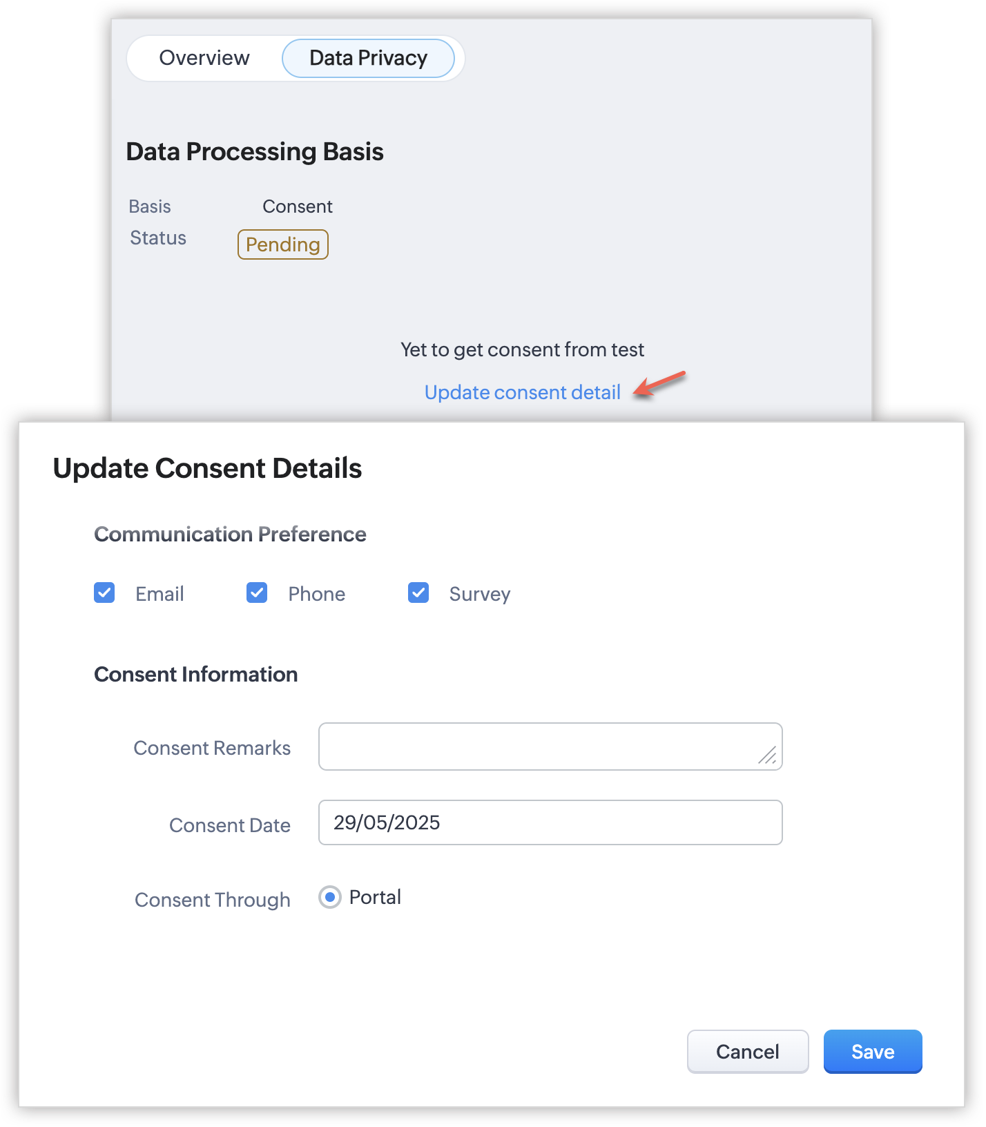 - Utilizatorul portalului poate actualiza și detaliile de consimțământ ale leadurilor sau contactelor pe care le-a adăugat.