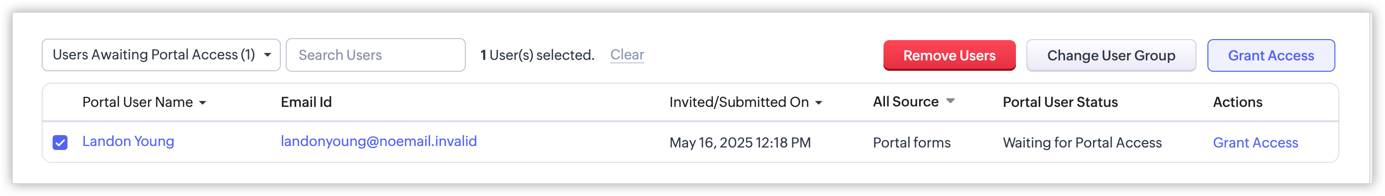 - Users Awaiting Portal Access: Acești utilizatori s-au înregistrat folosind formulare de portal, dar nu au accesat încă grupul de utilizatori ai portalului. Acest lucru se întâmplă când limita de acces a formularului de portal este atinsă. Odată ce administratorul a achiziționat licențe suficiente pentru a-i admite în grupul de utilizatori, poate acorda acces utilizatorilor în așteptare.