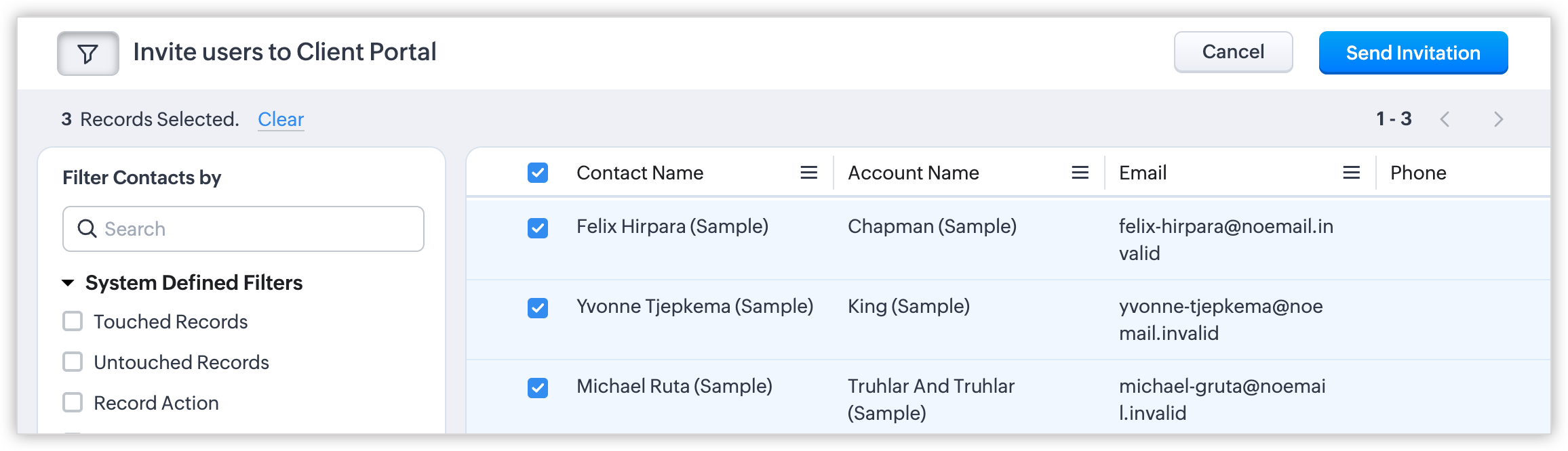 - Dacă schimbi numărul de telefon al utilizatorului în CRM, utilizatorul va fi re-invitat la portal prin intermediul noului număr de telefon.