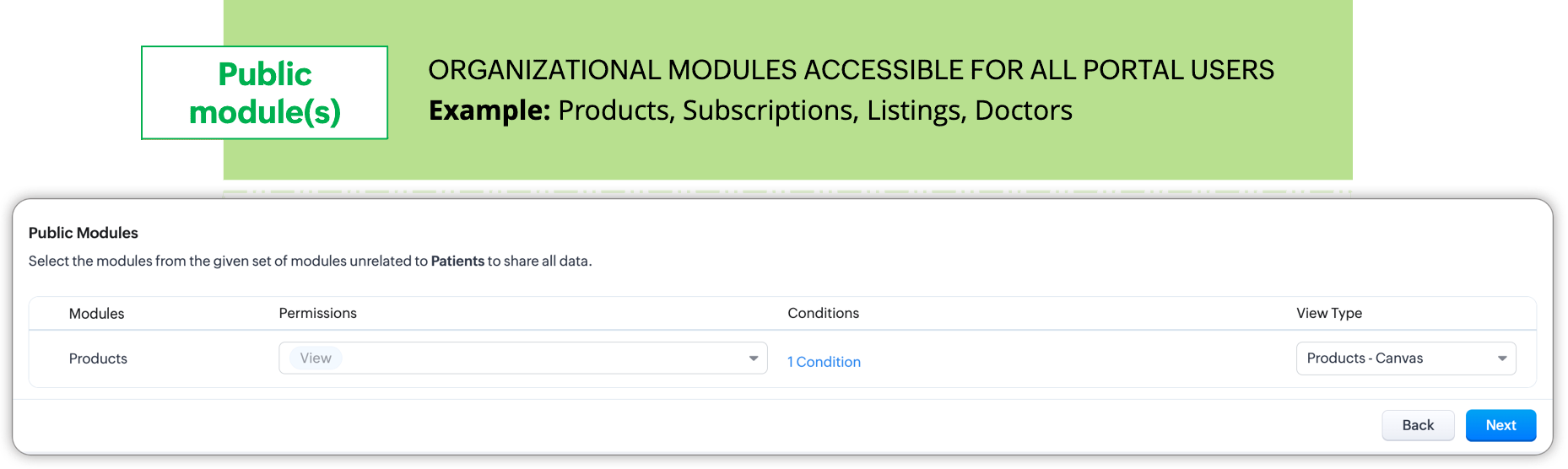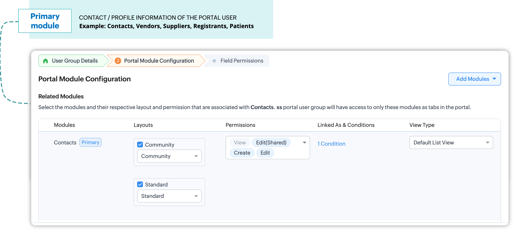 De exemplu: Pentru grupul de utilizatori Clienți, modulul primar ar putea fi modulul Contacte. Clienții pot accesa informațiile lor personale după autentificarea în portal, își pot actualiza profilul și preferințele, pot atașa formulare de solicitare și altele. - Module asociate: Modulele asociate conțin informații tranzacționale ale înregistrărilor din modulul primar. Adică, aceste module sunt conectate la înregistrarea primară datorită tranzacțiilor efectuate.