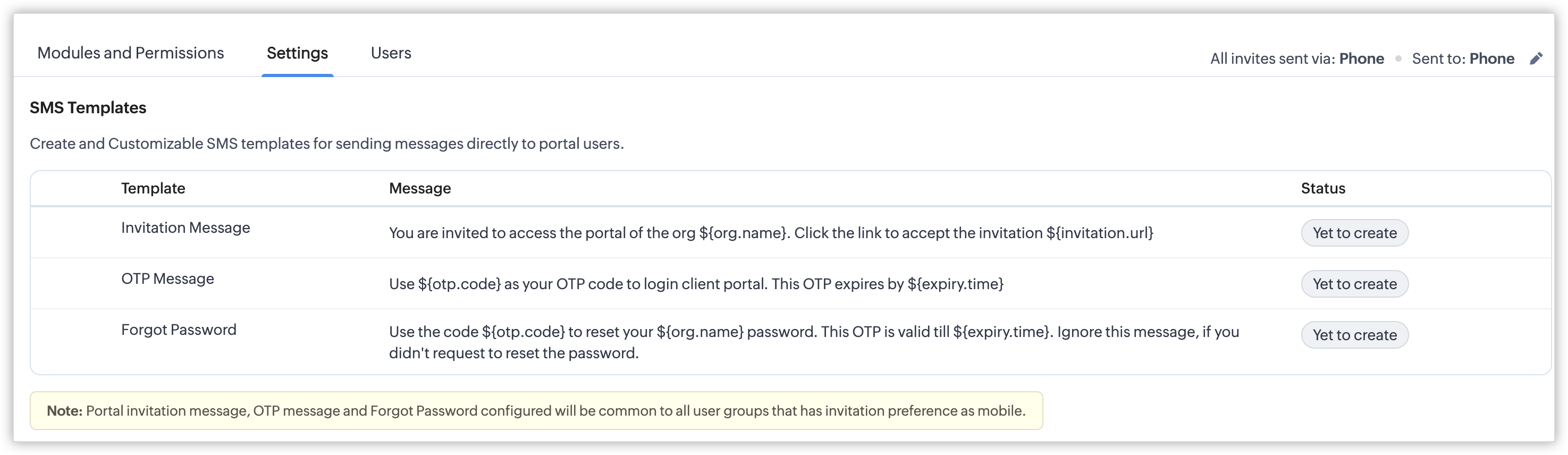 - Șabloanele SMS NU sunt specifice grupurilor individuale de utilizatori ai portalului. Modificările aduse șabloanelor vor fi reflectate în SMS-urile pentru toate grupurile de utilizatori ai portalului cu preferința de invitație setată ca Phone.