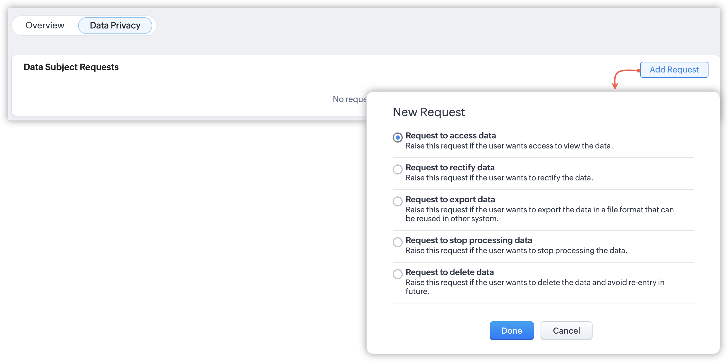 - Fila de confidențialitate a datelor va fi afișată pentru o înregistrare doar dacă setările de conformitate sunt activate.