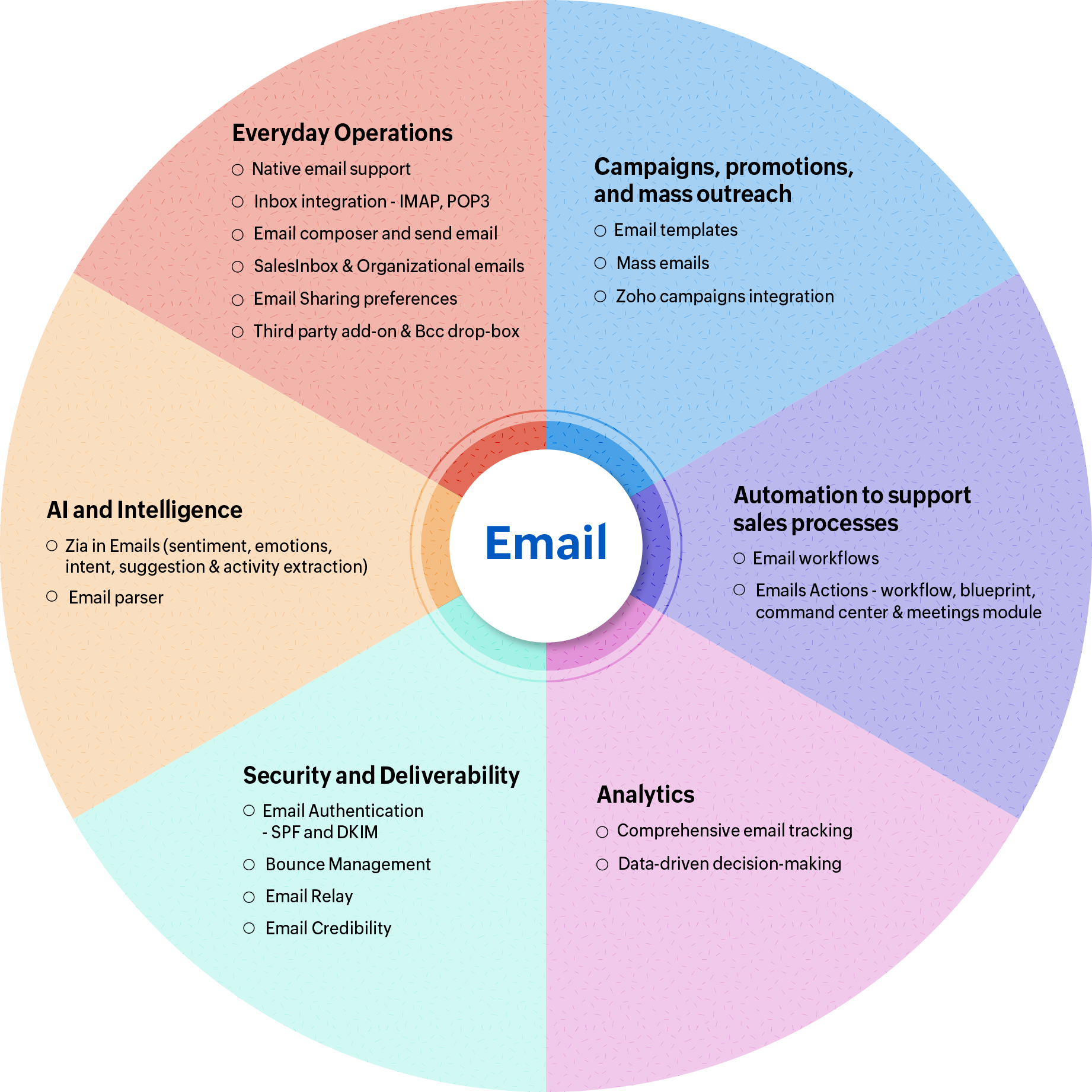 Aici am încercat să clasificăm funcționalitățile de email disponibile în Zoho CRM în funcție de utilitatea lor pentru utilizatorii finali. Emailurile au fost grupate în șase categorii distincte, aliniate cu relevanța și aplicabilitatea lor în cadrul afacerii tale.