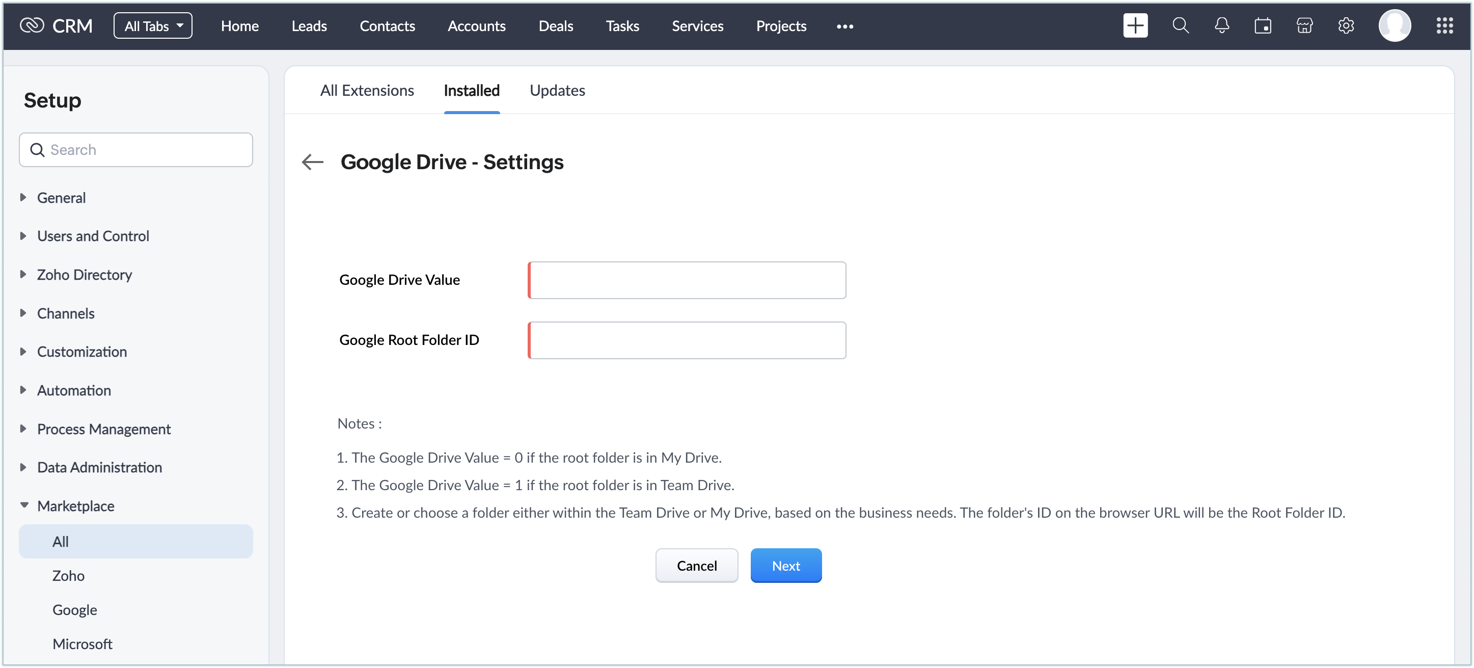 Dacă sari peste acest pas, poți autoriza extensia mai târziu mergând la Settings > Setup > Marketplace > All. Caută extensia Google Drive și fă clic pe Configure.