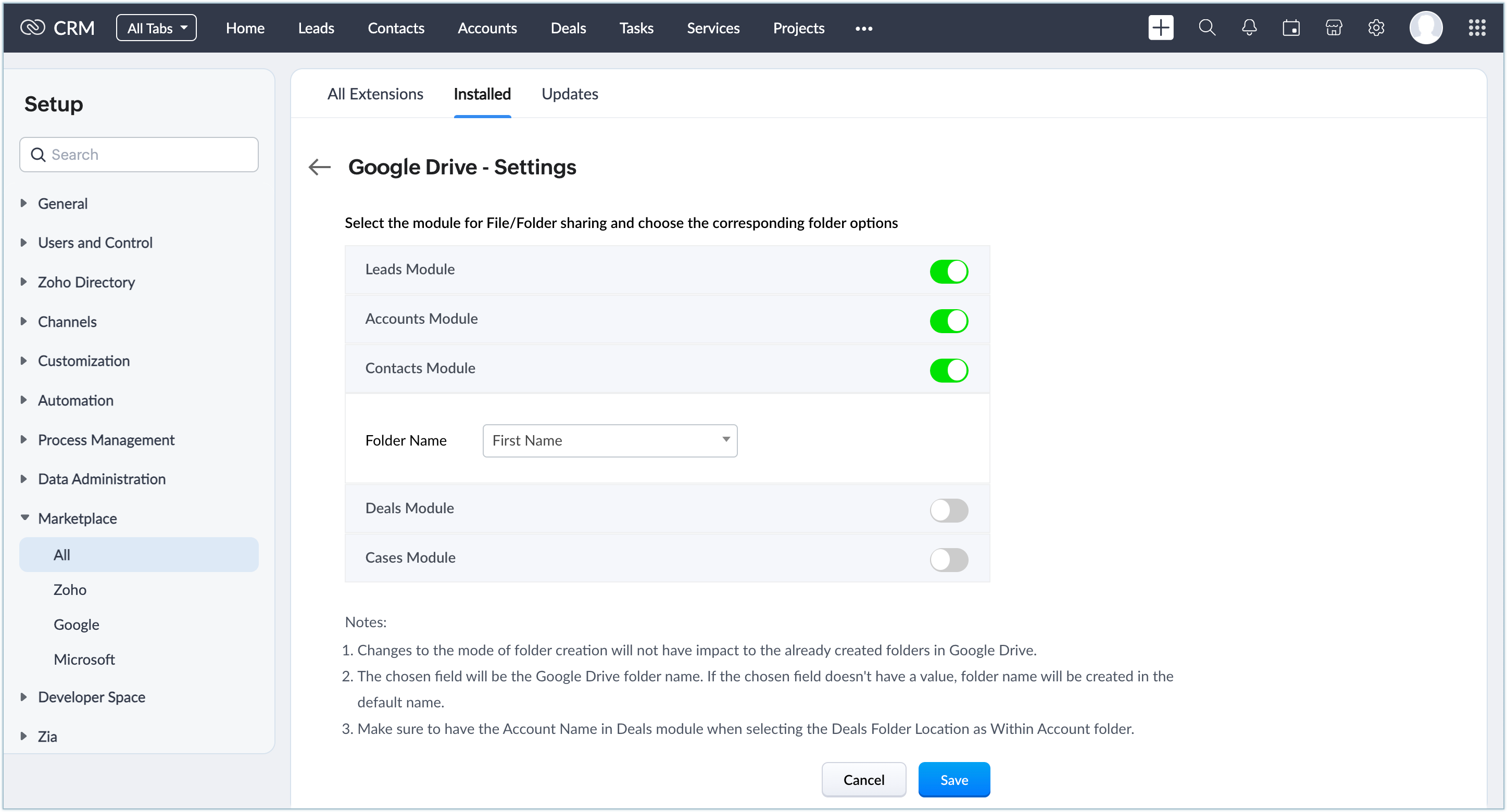 Pentru a partaja fișiere din Zoho CRM în Google Drive: