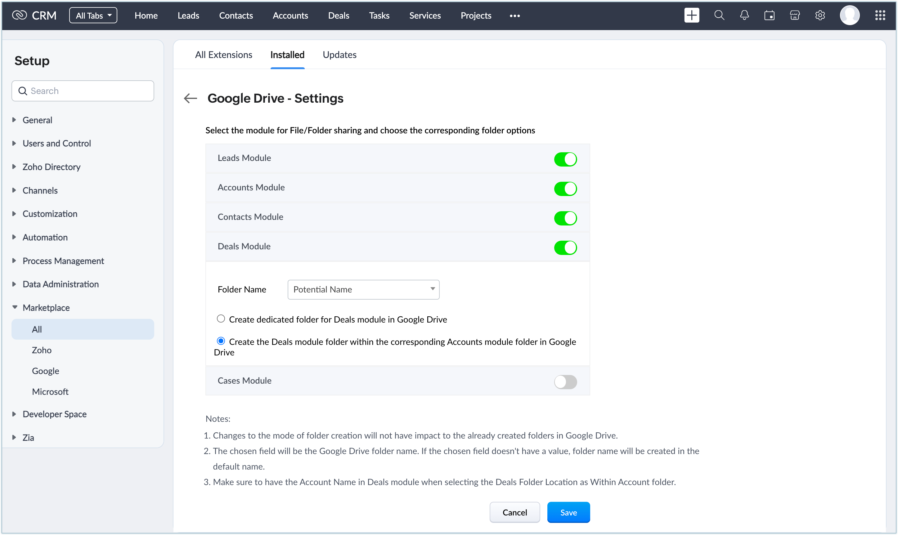 - Doar pentru modulul Deals, poți alege să creezi foldere pentru modul sau folderele pot fi create în cadrul folderului modulului Accounts corespunzător.