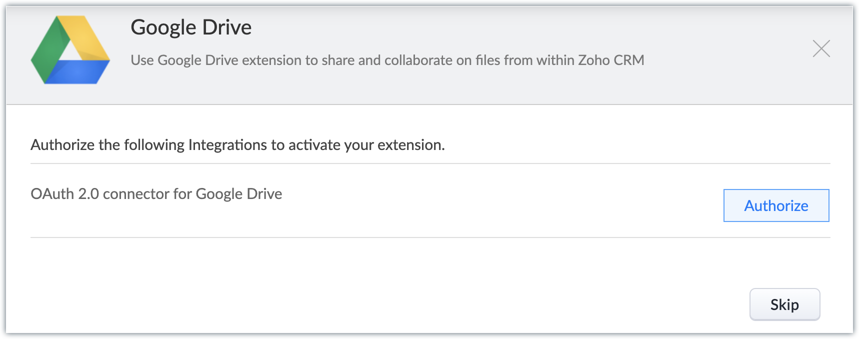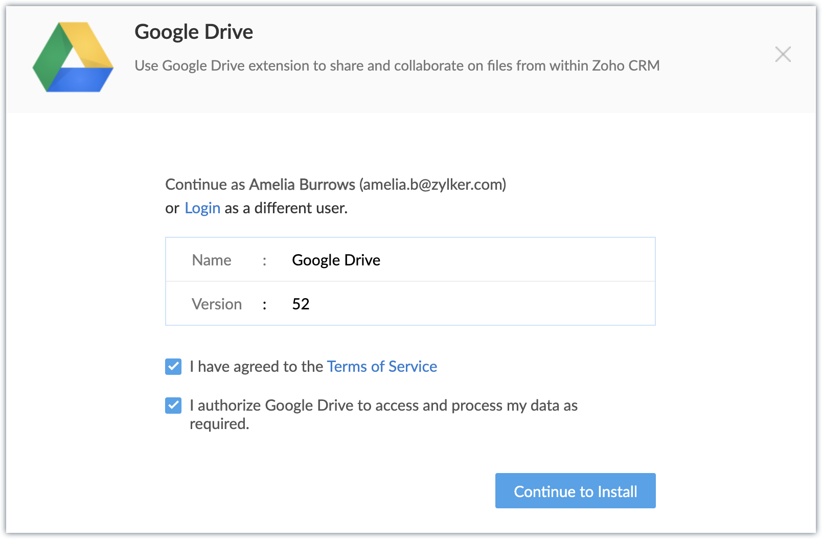 - Acordă permisiunea Zoho CRM de a se sincroniza cu Google Drive, astfel încât să poți încărca și partaja fișiere din CRM în contul tău Google Drive. Contul va fi apoi autorizat și extensia va fi activată.