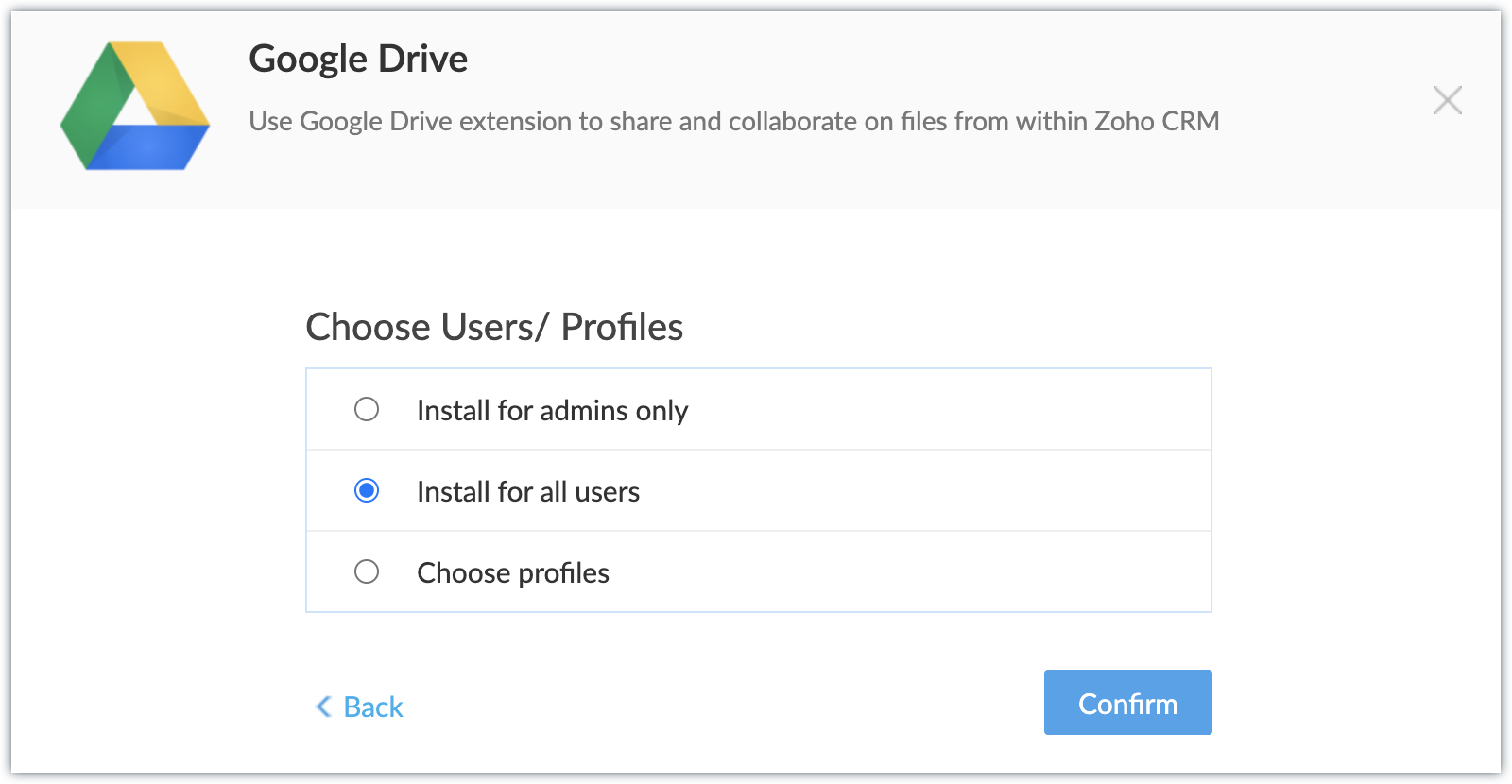 Extensia va fi instalată pentru utilizatorii specificați. După instalare, acei utilizatori trebuie să se autorizeze folosind credențialele lor Google Drive.