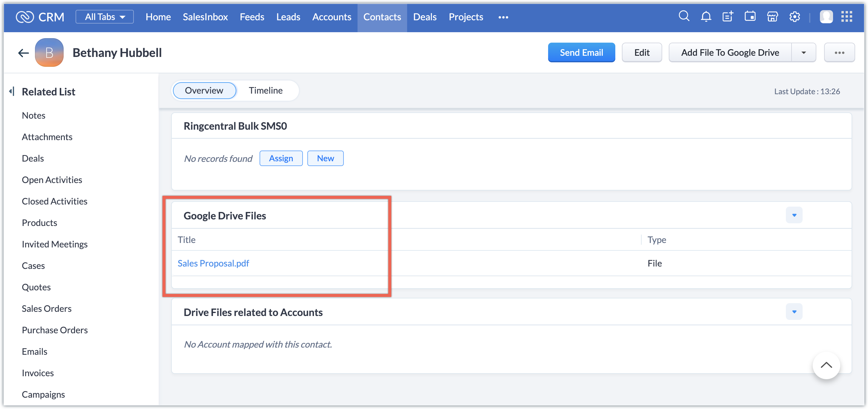 Folosind extensia Google Drive, poți crea, vizualiza, partaja și încărca fișiere direct din contul tău CRM în Google Drive. Ori de câte ori creezi un contact sau un lead în Zoho CRM, un folder pentru acea înregistrare este creat automat în folderul rădăcină. Poți încărca fișiere în acele foldere, iar acele fișiere vor fi de asemenea listate în lista Google Drive a înregistrării.