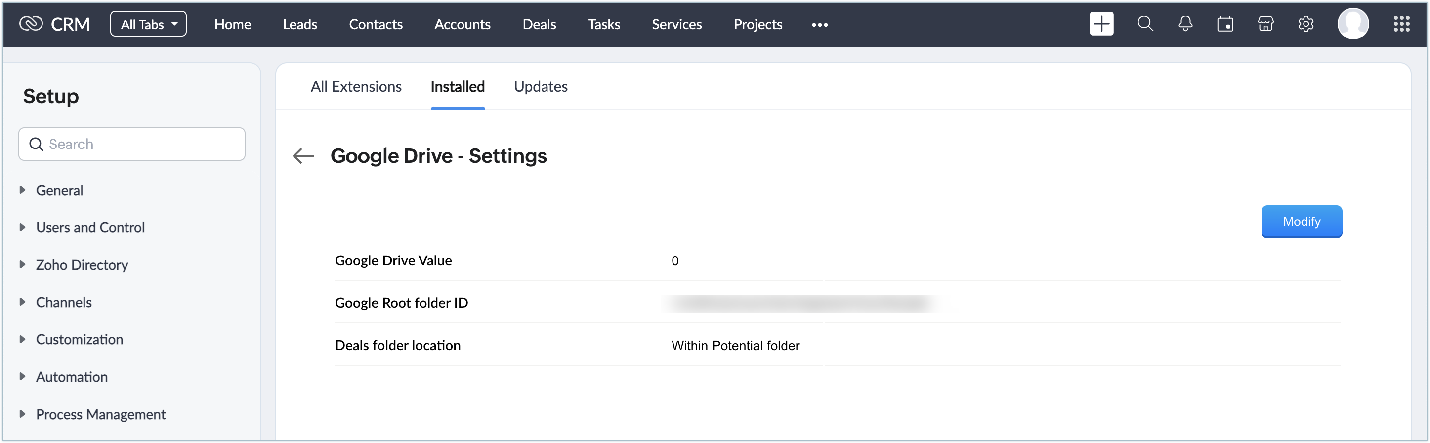 Pe baza acestor setări de configurare, extensia va sincroniza datele între Google Drive și Zoho CRM. Setările pot fi modificate oricând folosind butonul Modify, fără a avea vreun impact asupra datelor existente în Google Drive.