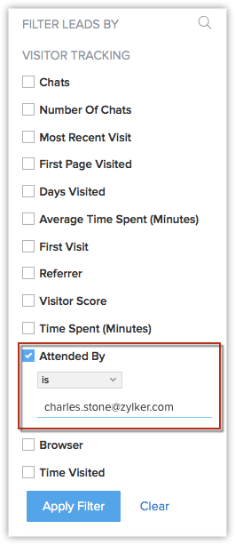 Ai filtrat contactele în funcție de etapele lor din pipeline-ul de vânzări. Managerii de vânzări pot urmări progresul reprezentanților de vânzări introducând adresa de e-mail a reprezentantului care s-a ocupat de anumite lead-uri. Să zicem, de exemplu, că îl cauți pe Charles Stone, reprezentantul tău de vânzări. Iată ce vei face: