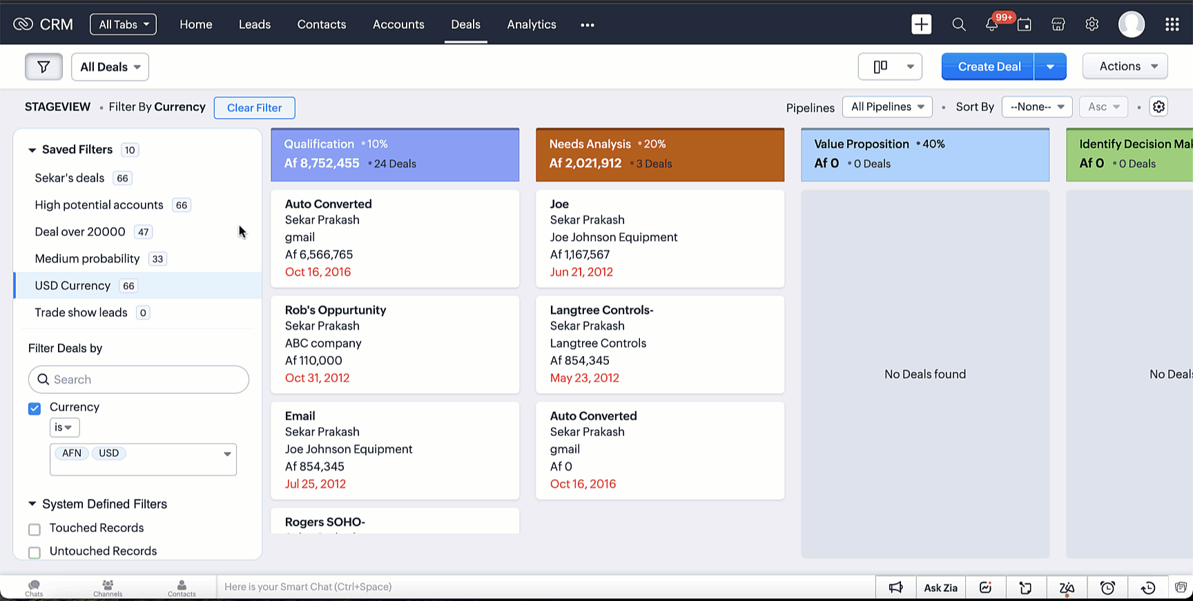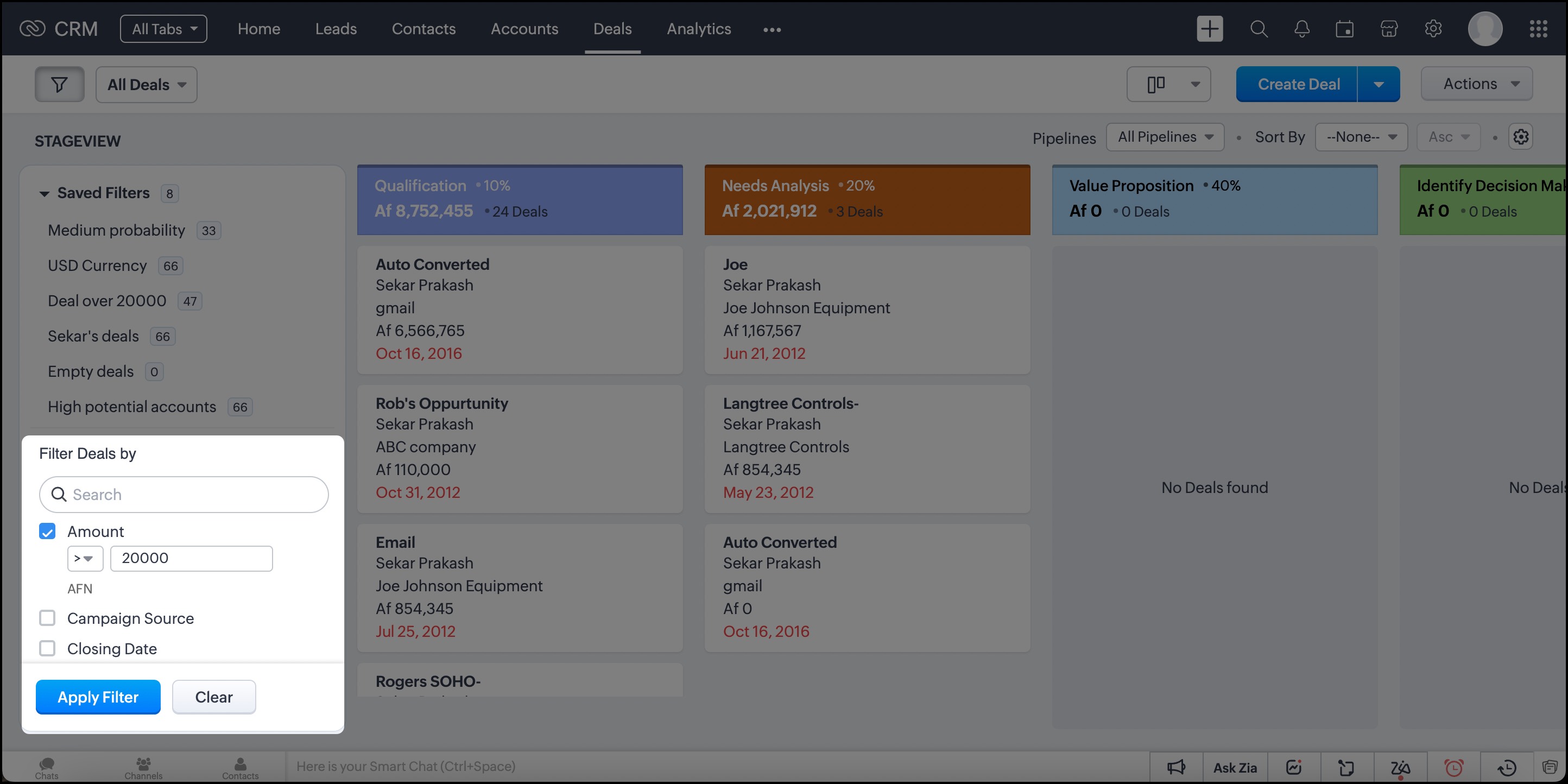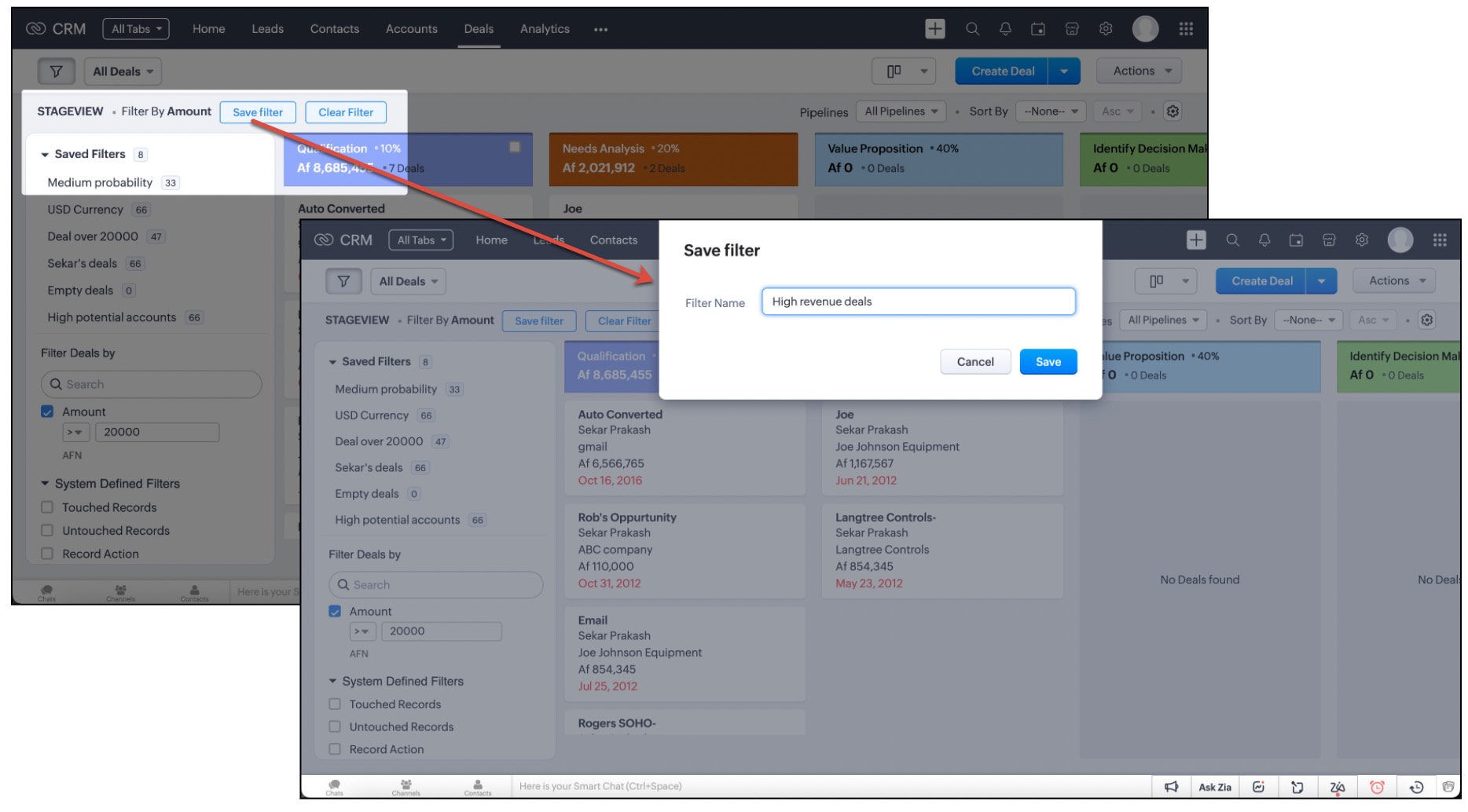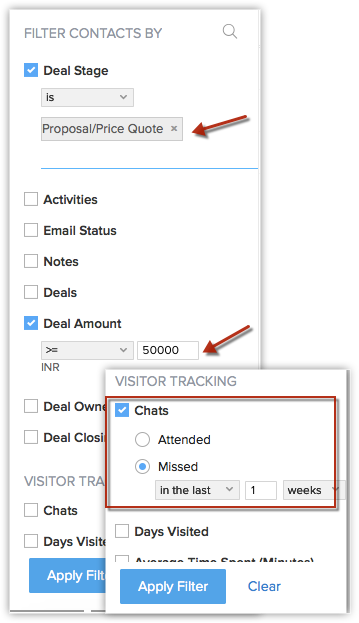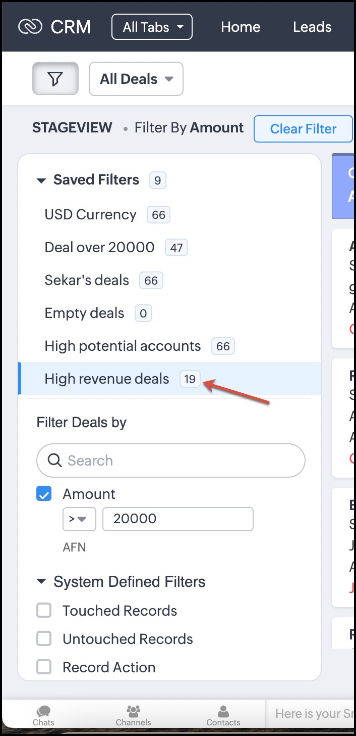 Să zicem că ai o listă de contacte care se află într-o anumită etapă de conversie. De exemplu, ai contacte cu care închizi oferte luna aceasta. Poți restrânge mai precis selecția alegând o sumă potențială pentru aceste oferte. Unele dintre aceste contacte te-ar fi putut contacta prin chat, dar este posibil să fi ratat acele mesaje. Prin filtrele avansate, poți filtra instant aceste contacte. Iată cum: