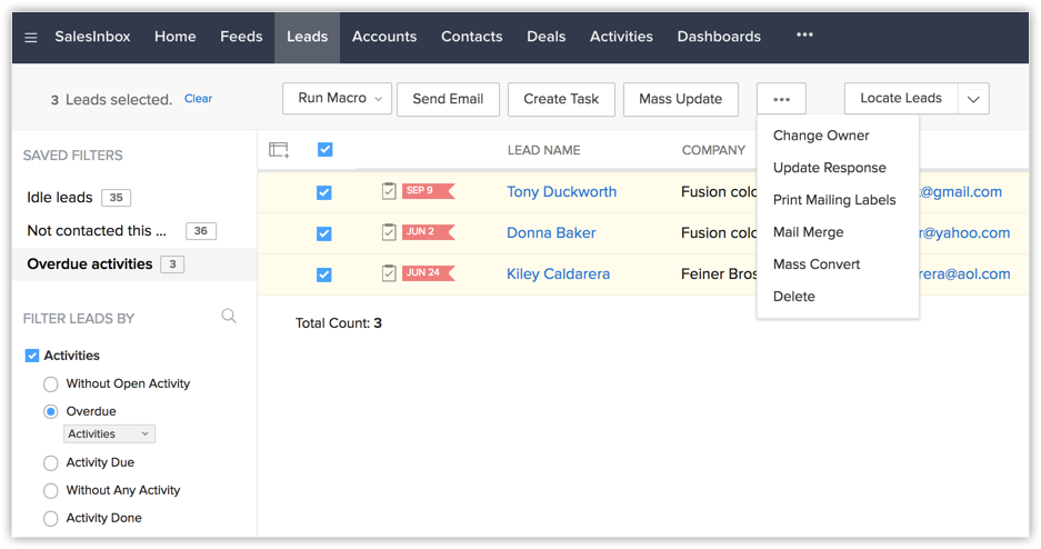 Filtrul avansat din Zoho CRM este un instrument util pentru găsirea informațiilor într-un modul CRM specific. Odată ce ai filtrat înregistrările, poți efectua acțiuni precum trimiterea de e-mailuri, adăugarea de etichete, schimbarea proprietarilor de înregistrări, actualizarea câmpurilor și altele. Poți chiar salva filtrele dacă le folosești frecvent. Reține că filtrele salvate sunt specifice fiecărui utilizator.