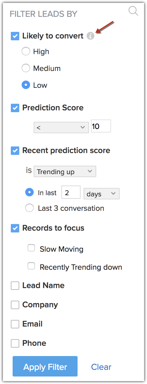 Poți fi întotdeauna la curent cu șansele de conversie a unui lead și de câștigare a unei oferte cu ajutorul Conversion Prediction de la Zia. Deși acest lucru îți facilitează prioritizarea lead-urilor și a ofertelor cu șanse mari de conversie, poți descoperi chiar și pe cele despre care credeai că au șanse reduse sau inexistente de conversie, dar care sunt în creștere. Folosind filtrele avansate, poți extrage lead-urile și ofertele care au evoluat recent pozitiv cu șanse de conversie mai mari decât înainte, asigurându-te că nu ratezi nicio oportunitate.