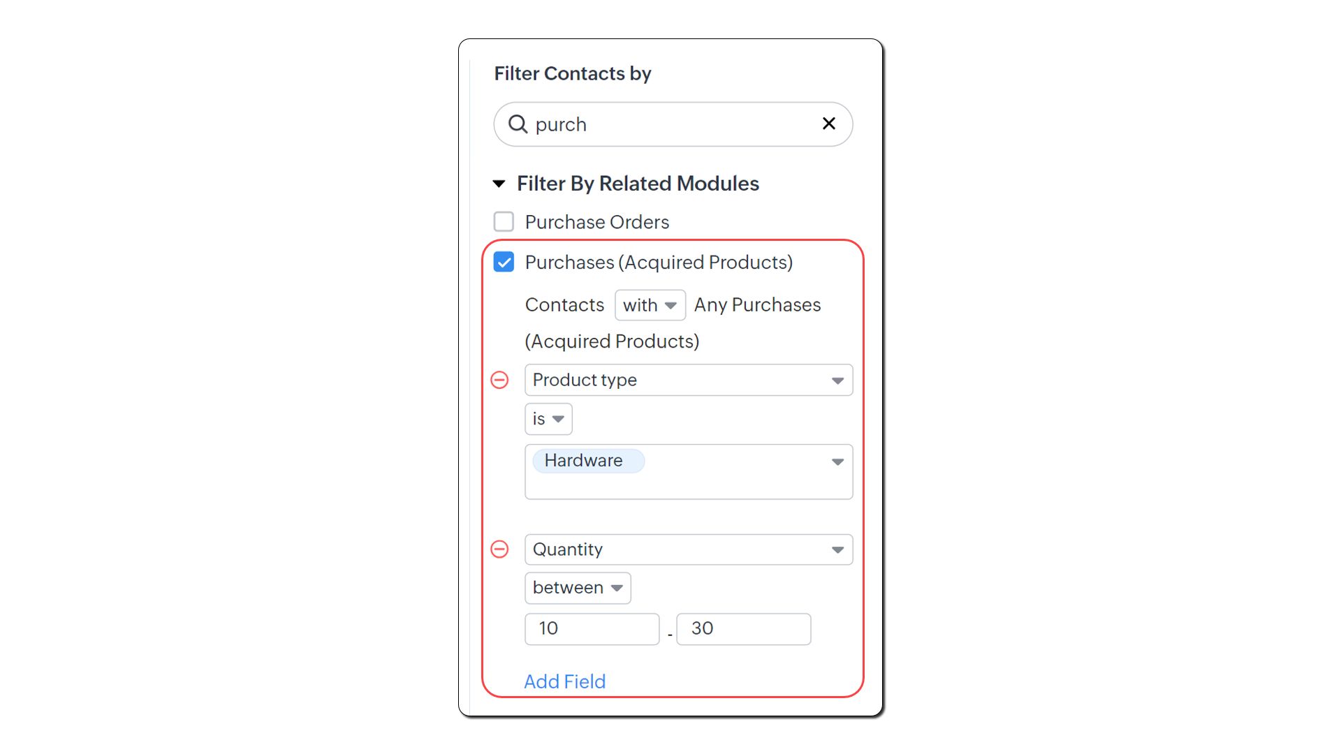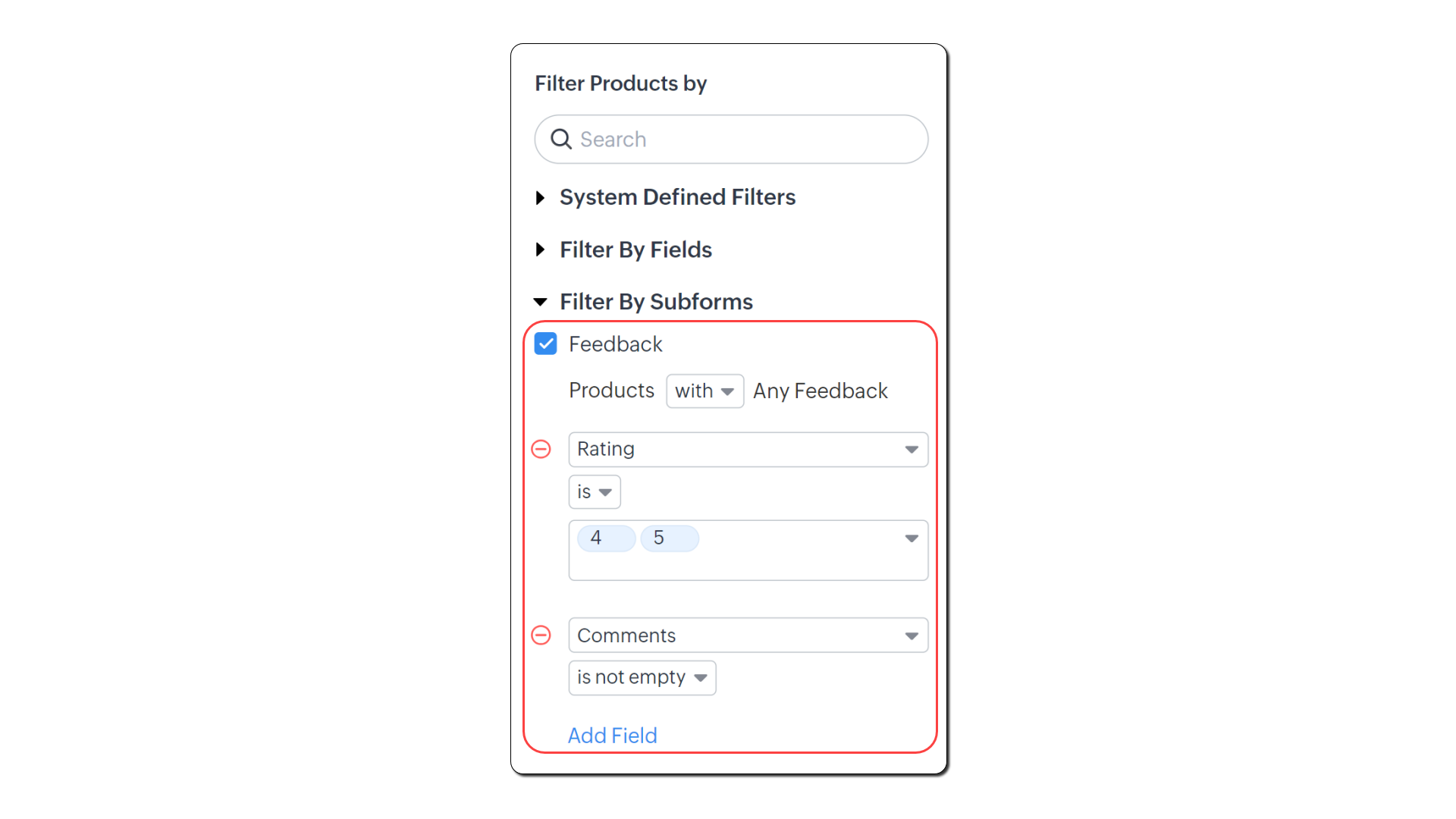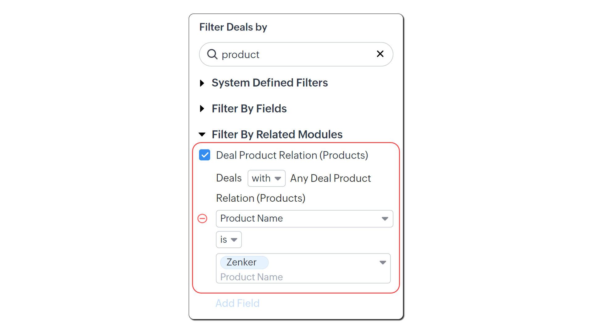 - Fă clic pe Add Field și selectează Product name is [numele produsului/produselor]. Adaugă alte câmpuri și opțiuni după necesități.