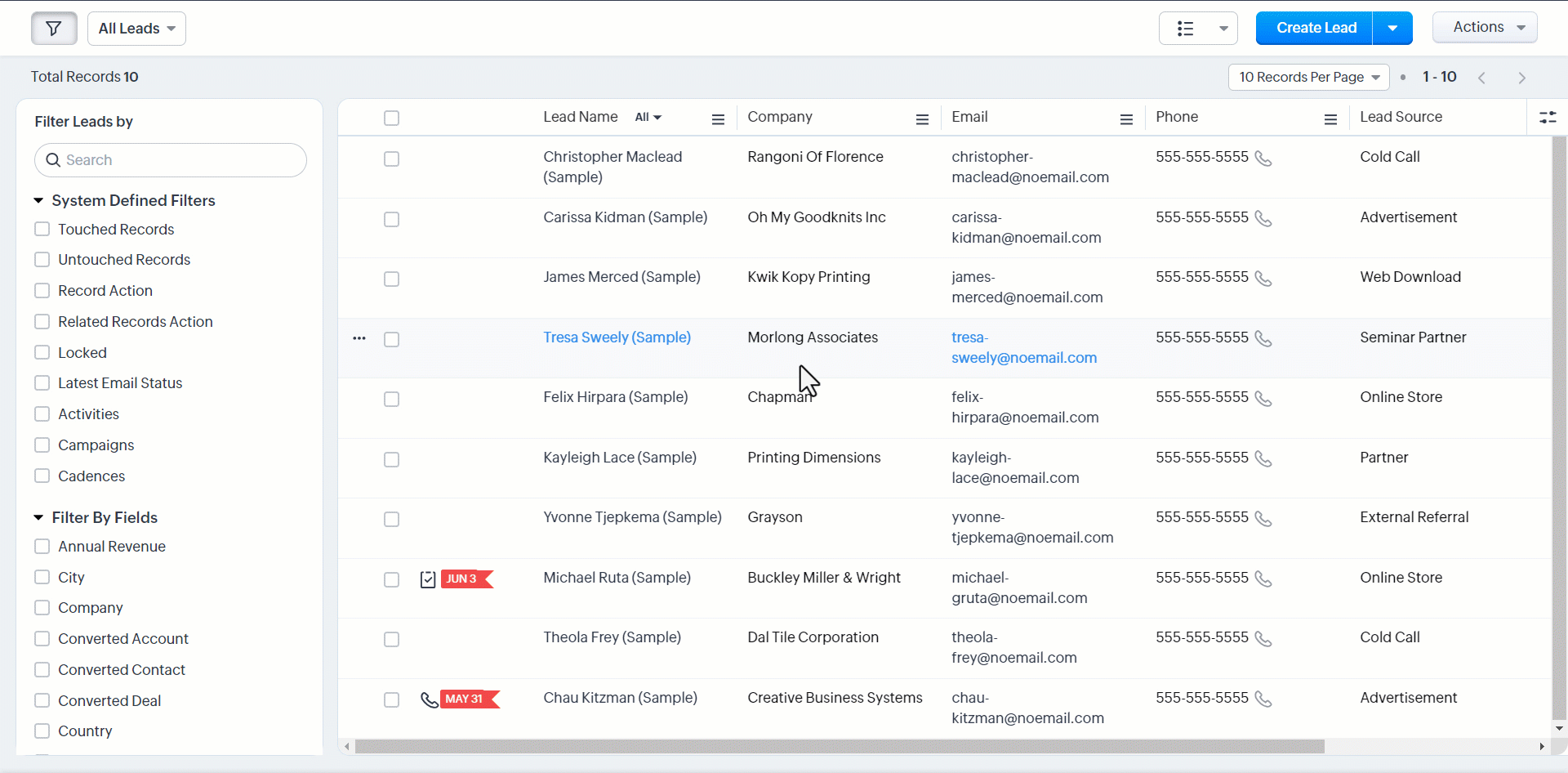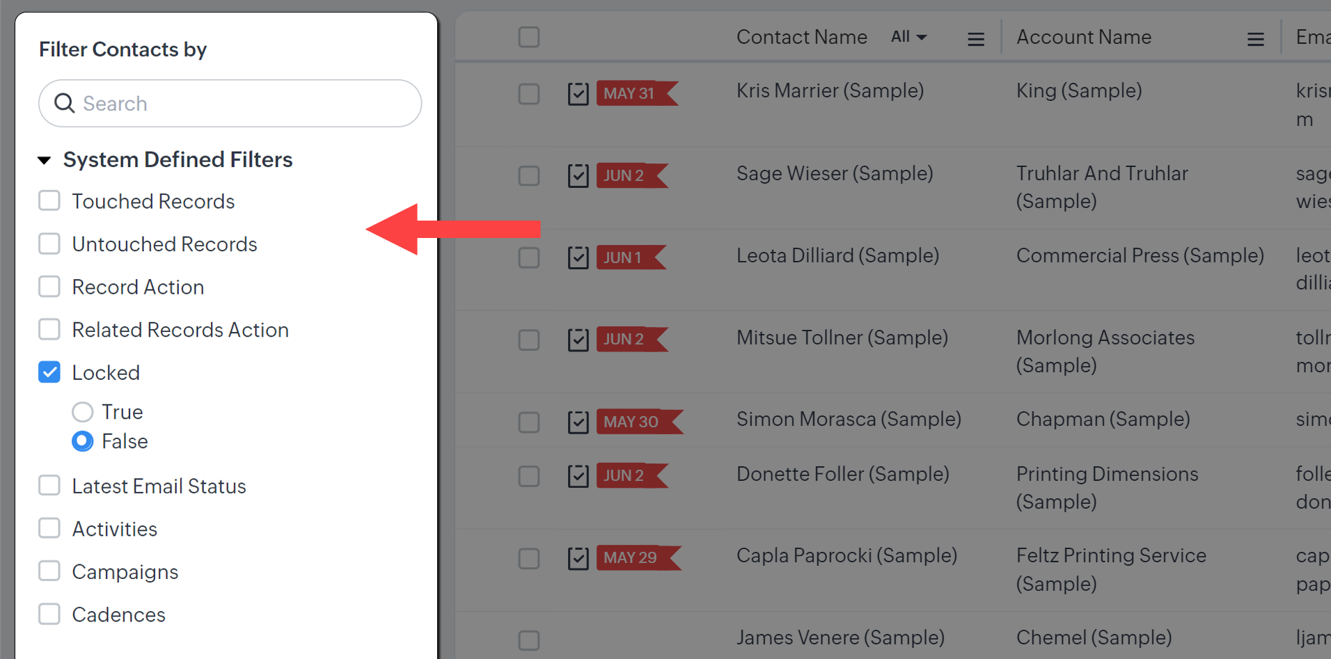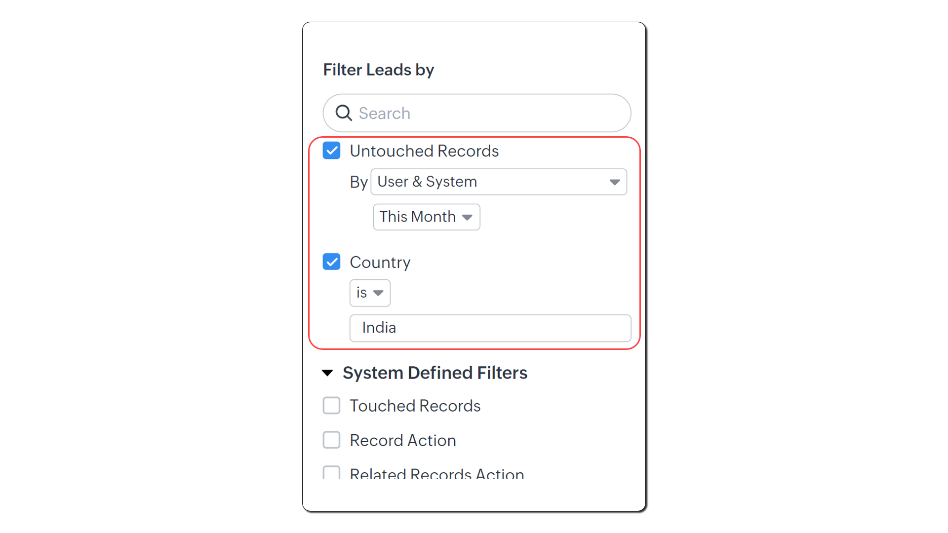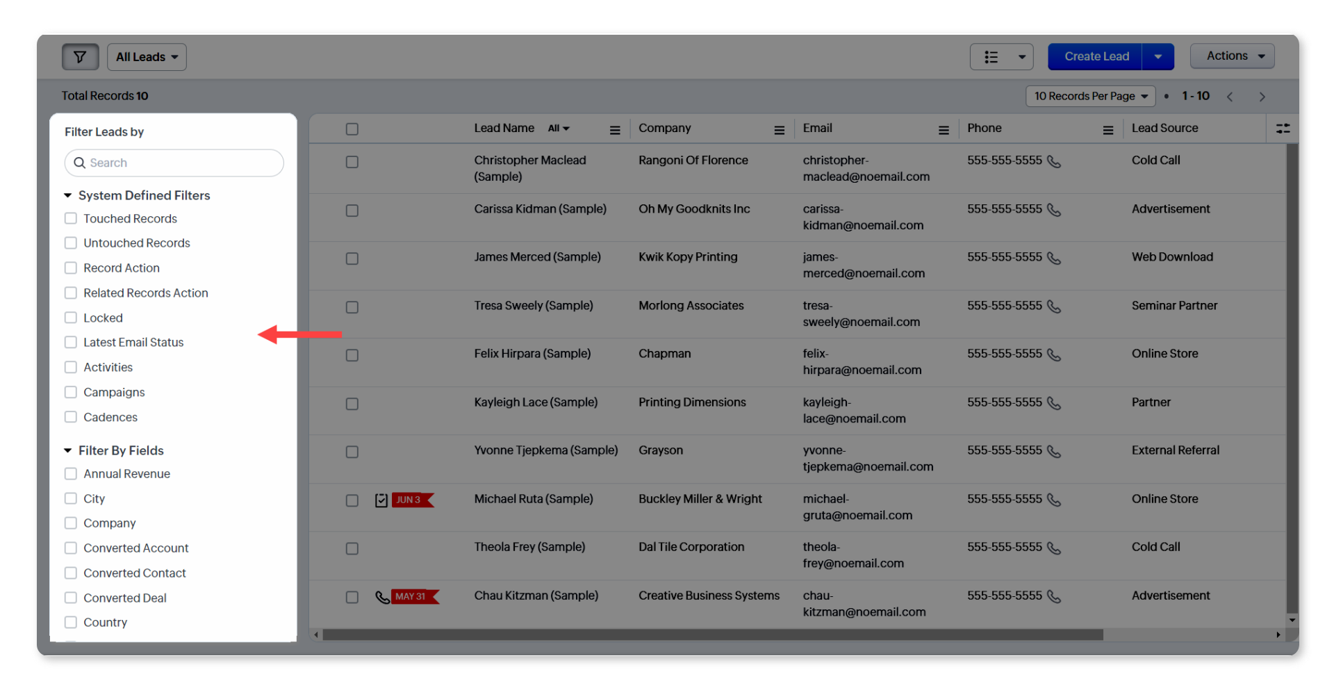 De exemplu, poți filtra lead-urile care sunt „neabordate" de șase luni. Nu trebuie să rulezi un raport separat; filtrul de urmărire a timpului numit „Untouched records" îți va oferi această imagine.
